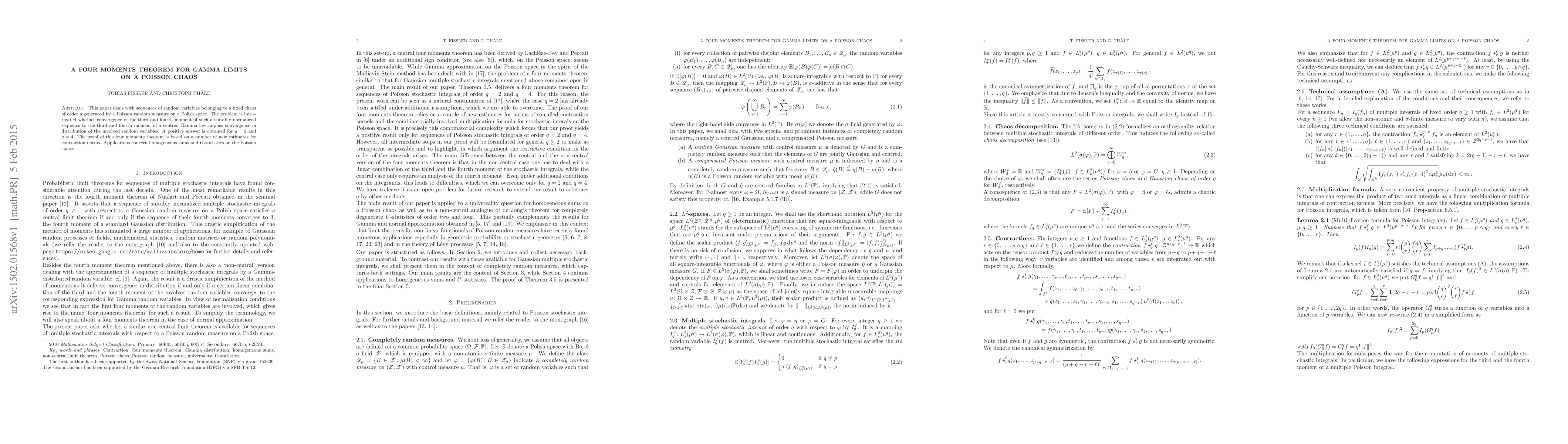 This paper establishes a four moments theorem for sequences of random variables from a Poisson chaos, proving convergence in distribution for $q=2$ and $q=4 when third and fourth moments converge to those of a centered Gamma law. The proof relies on new contraction norm estimates, with applications to homogeneous sums and $U$-statistics.