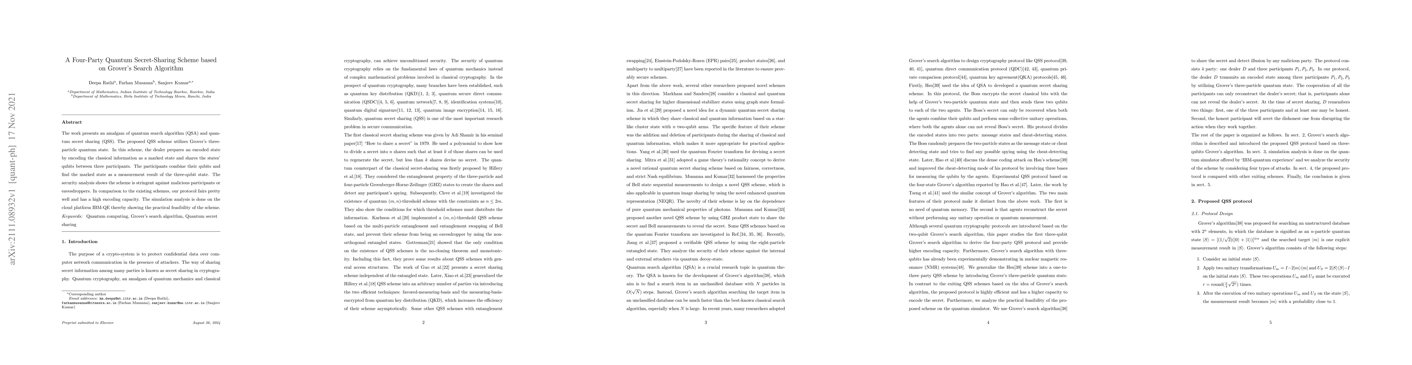 This paper proposes a four-party quantum secret-sharing scheme leveraging Grover's search algorithm, utilizing a three-particle quantum state for secure information sharing. The scheme demonstrates high security and encoding capacity, with practical feasibility confirmed via simulation on IBM-QE.