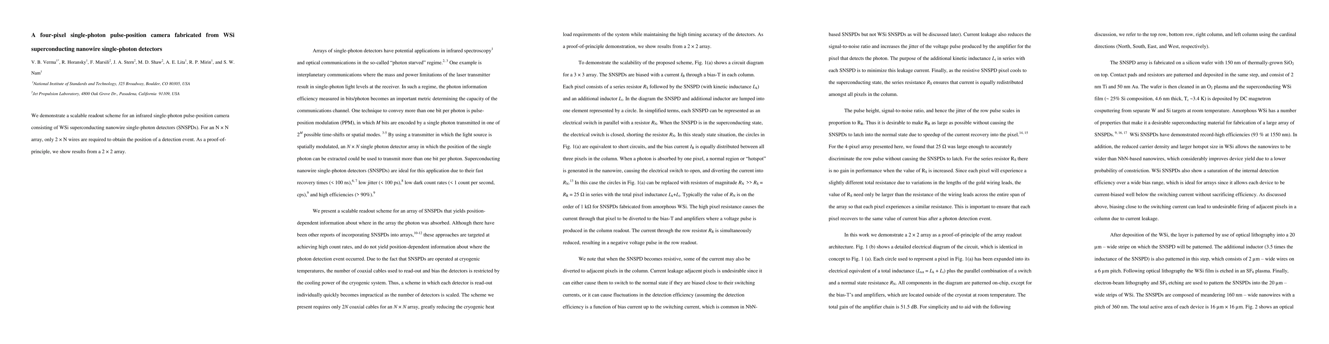 This paper presents a scalable readout scheme for a single-photon pulse-position camera using WSi superconducting nanowire single-photon detectors (SNSPDs), requiring only four pixels for a 2 x 2 array to determine the position of detection events. The results demonstrate the feasibility of this method for infrared single-photon detection.