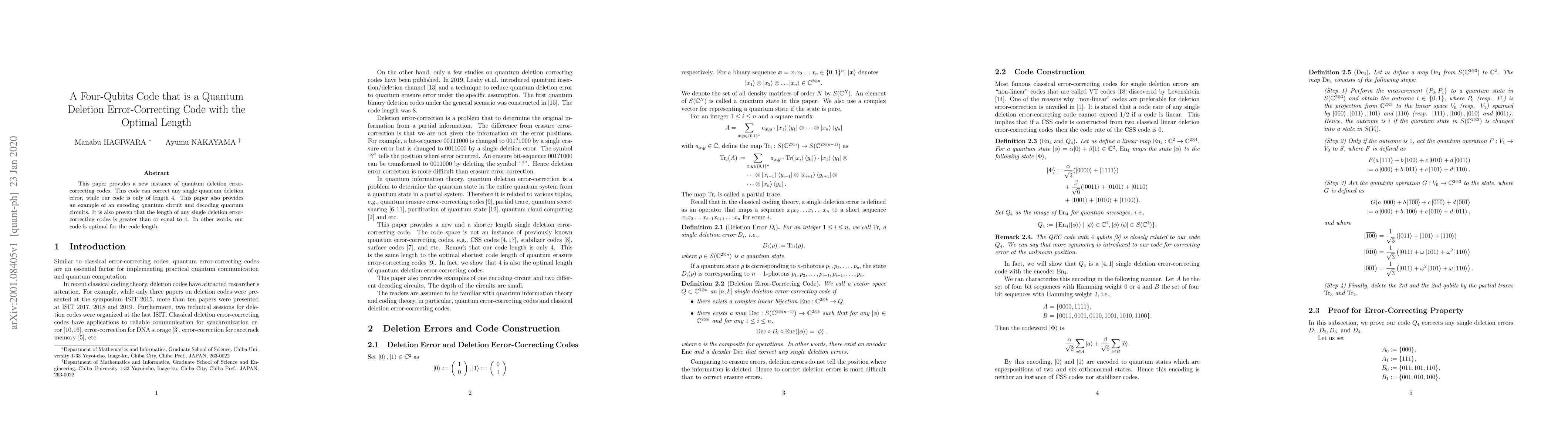 This paper introduces a four-qubit quantum deletion error-correcting code that optimally corrects single deletion errors, providing the shortest possible code length. It also includes examples of encoding and decoding quantum circuits.