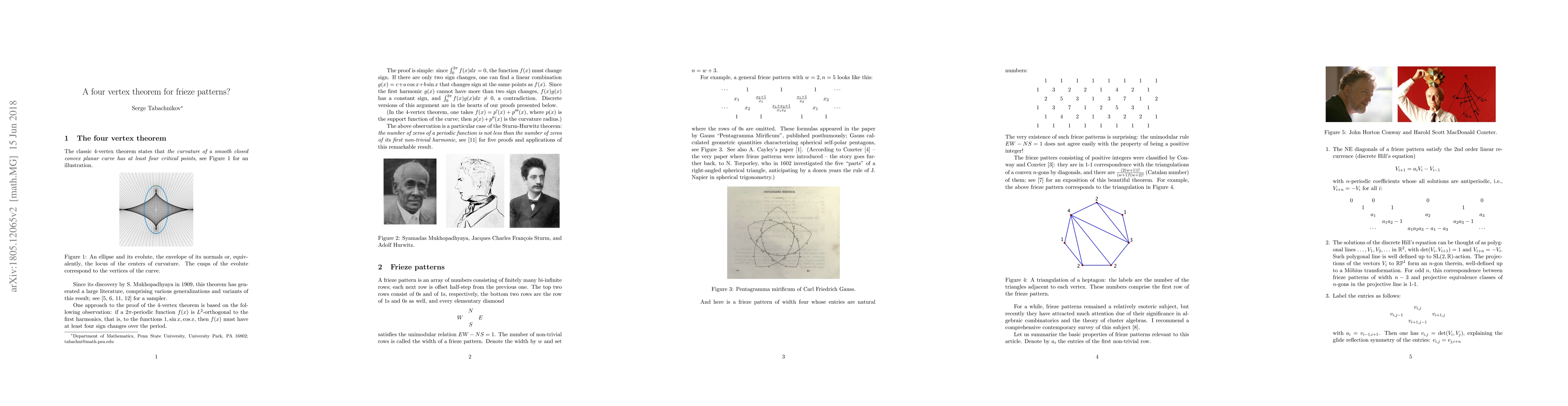 Given two Coxeter's frieze patterns with the same width and consisting of positive numbers, choose a row and consider the periodic sequence of the differences of the respective entries of the two friezes. We ask for which rows this sequence must change sign at least four times over the period. We prove that this is the case for the first and for the second non-trivial rows, and that this is true, for all rows, for an infinitesimal version of the question. The article also contains expository material on the four vertex theorem and on Coxeter's frieze patterns.