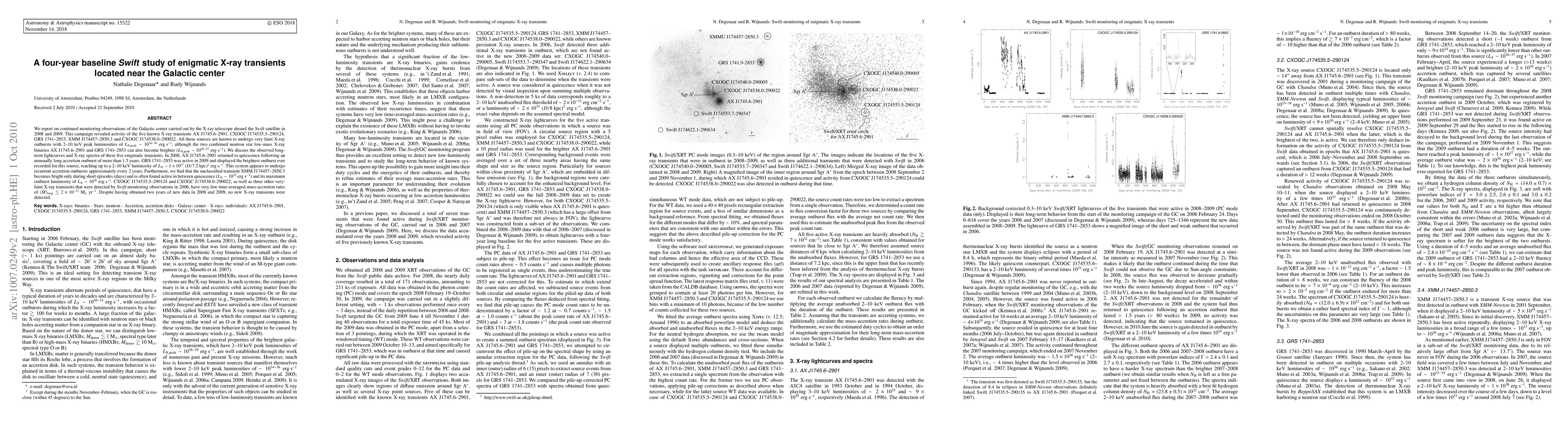 This study reports on the four-year X-ray monitoring of enigmatic transients near the Galactic center using the Swift satellite, revealing long-term lightcurves and spectra of five known transients, with notable outbursts from GRS 1741-2853 and short-lived activity in XMM J174457-2850.3, while no new transients were detected.