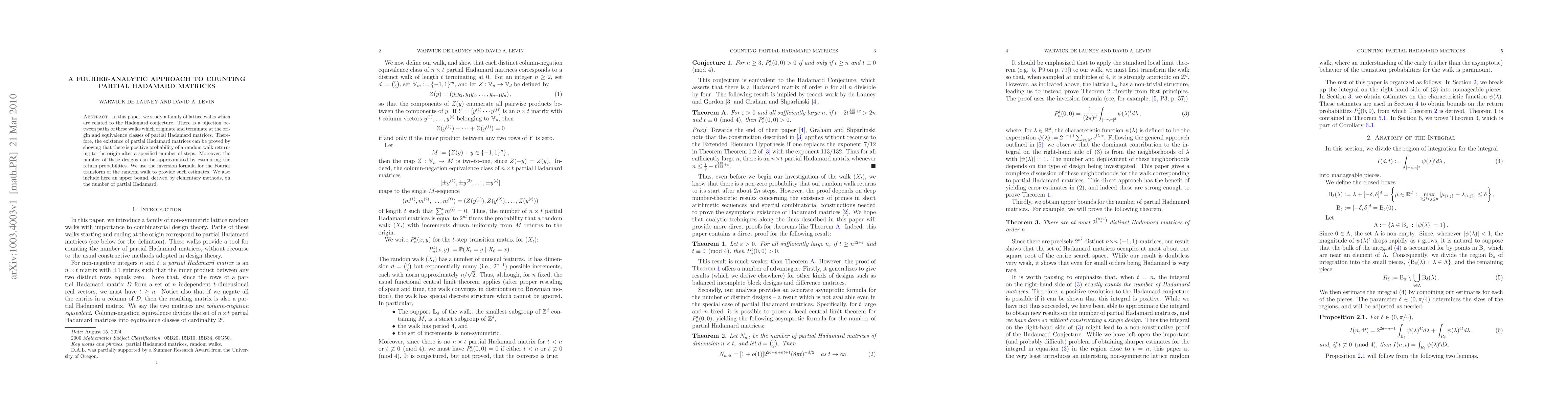 In this paper, we study a family of lattice walks which are related to the Hadamard conjecture. There is a bijection between paths of these walks which originate and terminate at the origin and equivalence classes of partial Hadamard matrices. Therefore, the existence of partial Hadamard matrices can be proved by showing that there is positive probability of a random walk returning to the origin after a specified number of steps. Moreover, the number of these designs can be approximated by estimating the return probabilities. We use the inversion formula for the Fourier transform of the random walk to provide such estimates. We also include here an upper bound, derived by elementary methods, on the number of partial Hadamard.
