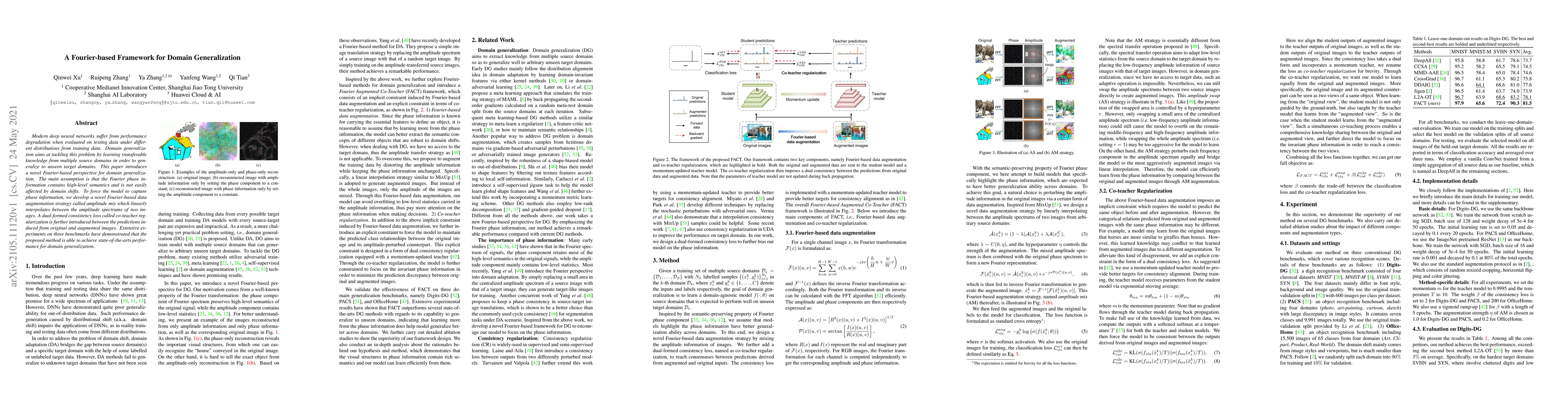 Modern deep neural networks suffer from performance degradation when evaluated on testing data under different distributions from training data. Domain generalization aims at tackling this problem by learning transferable knowledge from multiple source domains in order to generalize to unseen target domains. This paper introduces a novel Fourier-based perspective for domain generalization. The main assumption is that the Fourier phase information contains high-level semantics and is not easily affected by domain shifts. To force the model to capture phase information, we develop a novel Fourier-based data augmentation strategy called amplitude mix which linearly interpolates between the amplitude spectrums of two images. A dual-formed consistency loss called co-teacher regularization is further introduced between the predictions induced from original and augmented images. Extensive experiments on three benchmarks have demonstrated that the proposed method is able to achieve state-of-the-arts performance for domain generalization.