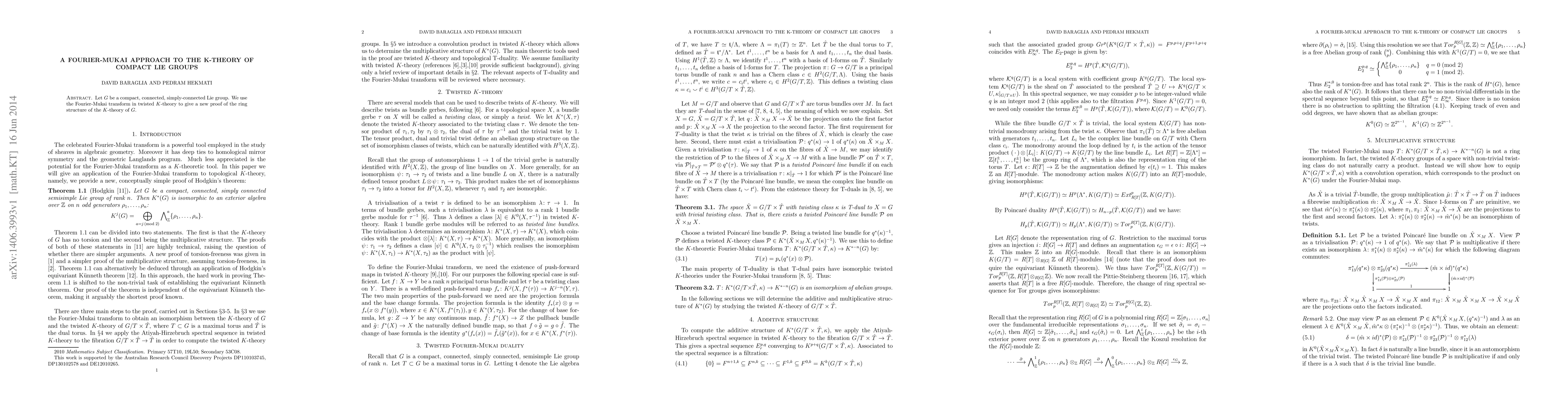 Let $G$ be a compact, connected, simply-connected Lie group. We use the Fourier-Mukai transform in twisted $K$-theory to give a new proof of the ring structure of the $K$-theory of $G$.