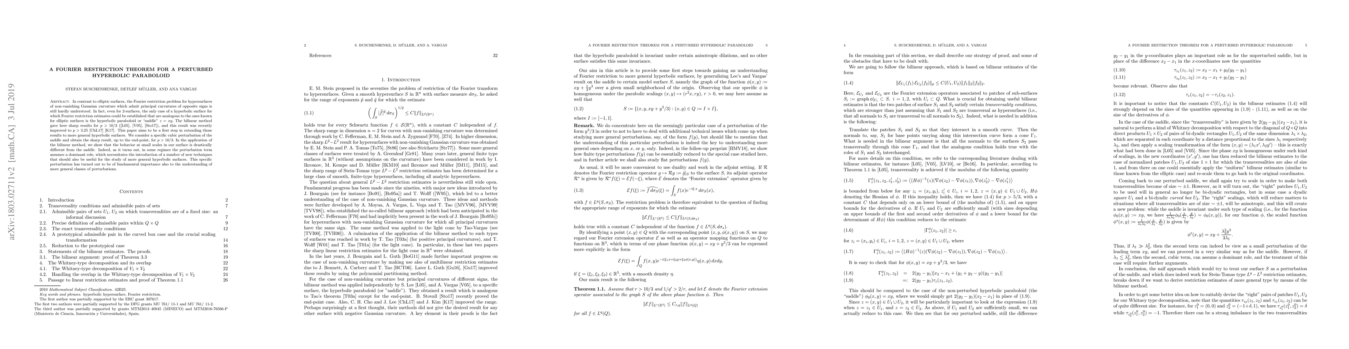 This paper investigates the Fourier restriction theorem for a perturbed hyperbolic paraboloid, specifically a cubic perturbation of the saddle z = xy. The authors extend previous results using the bilinear method to obtain sharp estimates for p > 10/3, introducing new techniques to handle the dominant role of the perturbation term at small scales.