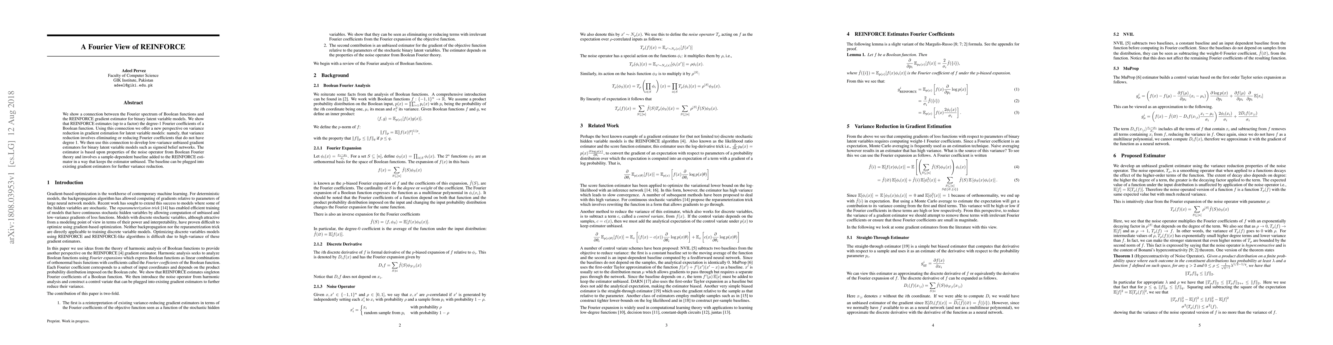 This paper establishes a link between the Fourier spectrum of Boolean functions and the REINFORCE gradient estimator, showing that REINFORCE estimates the degree-1 Fourier coefficients. It proposes a new perspective on variance reduction in gradient estimation by eliminating higher-degree Fourier coefficients, and develops a low-variance unbiased gradient estimator for binary latent variable models.