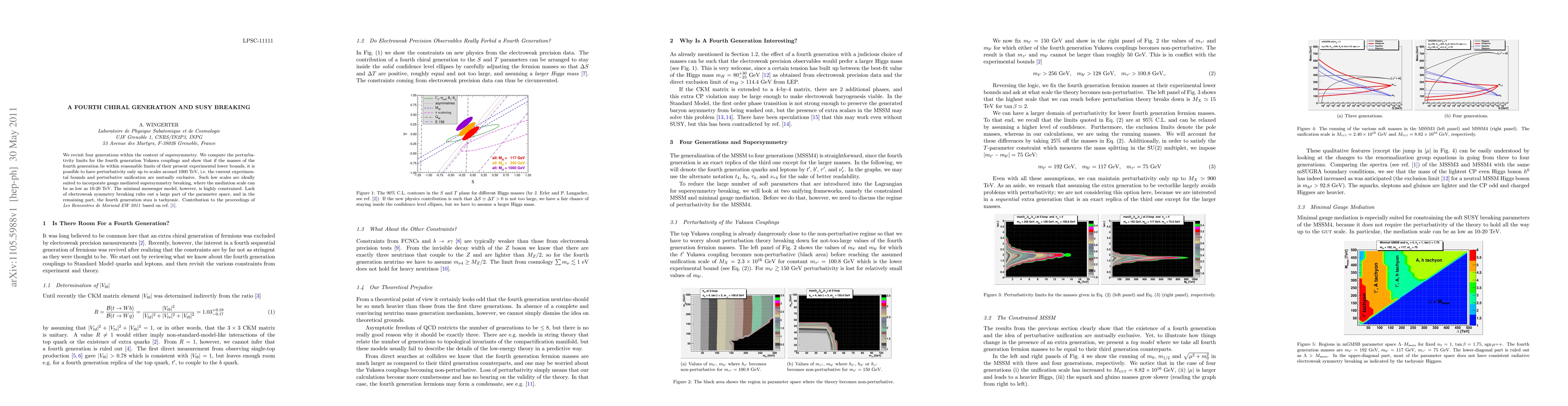 This paper explores the implications of a fourth chiral generation in supersymmetric models, finding that perturbativity limits for the fourth generation Yukawa couplings suggest unification scales around 1000 TeV, incompatible with current experimental bounds. It proposes gauge-mediated supersymmetry breaking at low scales, though the minimal messenger model is constrained, often resulting in tachyonic fourth-generation stau states.