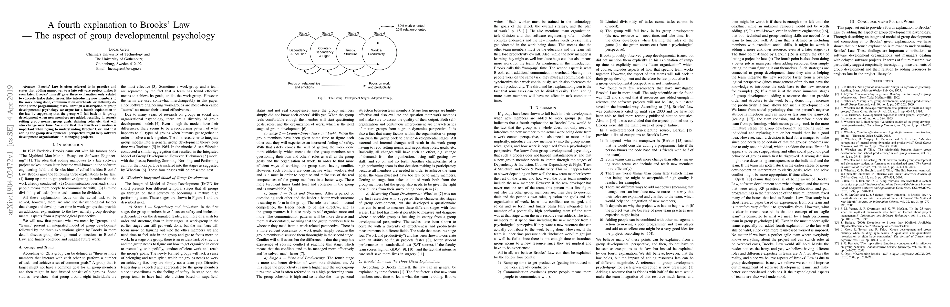 Brooks' Law is often referred to in practice and states that adding manpower to a late software project makes it even later. Brooks' himself gave three explanation only related to concrete task-related issues, like introducing new members to the work being done, communication overheads, or difficulty dividing some programming tasks. Through a description of group developmental psychology we argue for a fourth explanation to the law by suggesting that the group will fall back in its group development when new members are added, resulting in rework setting group norms, group goals, defining roles etc. that will also change over time. We show that this fourth explanation is important when trying to understanding Brooks' Law, and that adding the group developmental perspective might help software development organizations in managing projects.