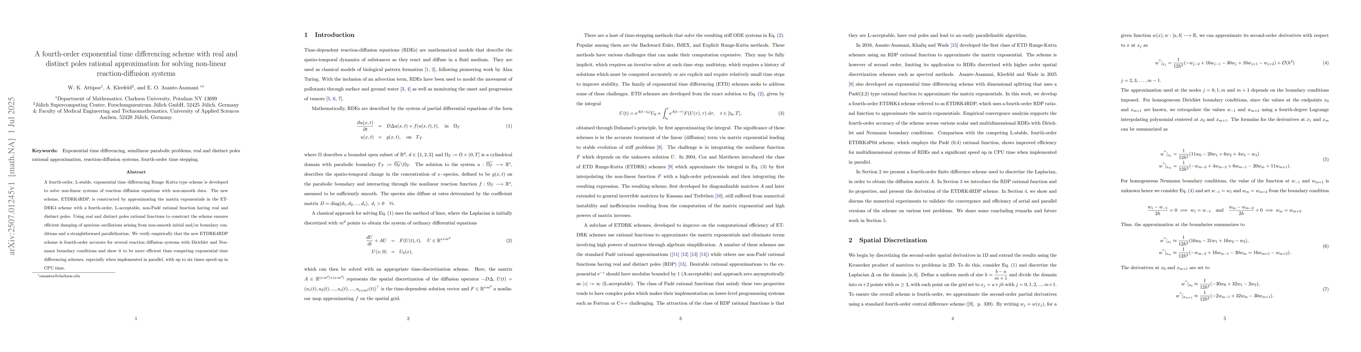 A fourth-order, L-stable, exponential time differencing Runge-Kutta type scheme is developed to solve nonlinear systems of reaction diffusion equations with nonsmooth data. The new scheme, ETDRK4RDP, is constructed by approximating the matrix exponentials in the ETDRK4 scheme with a fourth order, L-acceptable, non-Pad\'e rational function having real and distinct poles (RDP). Using RDP rational functions to construct the scheme ensures efficient damping of spurious oscillations arising from non-smooth initial and boundary conditions and a straightforward parallelization. We verify empirically that the new ETDRK4RDP scheme is fourth-order accurate for several reaction diffusion systems with Dirichlet and Neumann boundary conditions and show it to be more efficient than competing exponential time differencing schemes, especially when implemented in parallel, with up to six times speedup in CPU time.