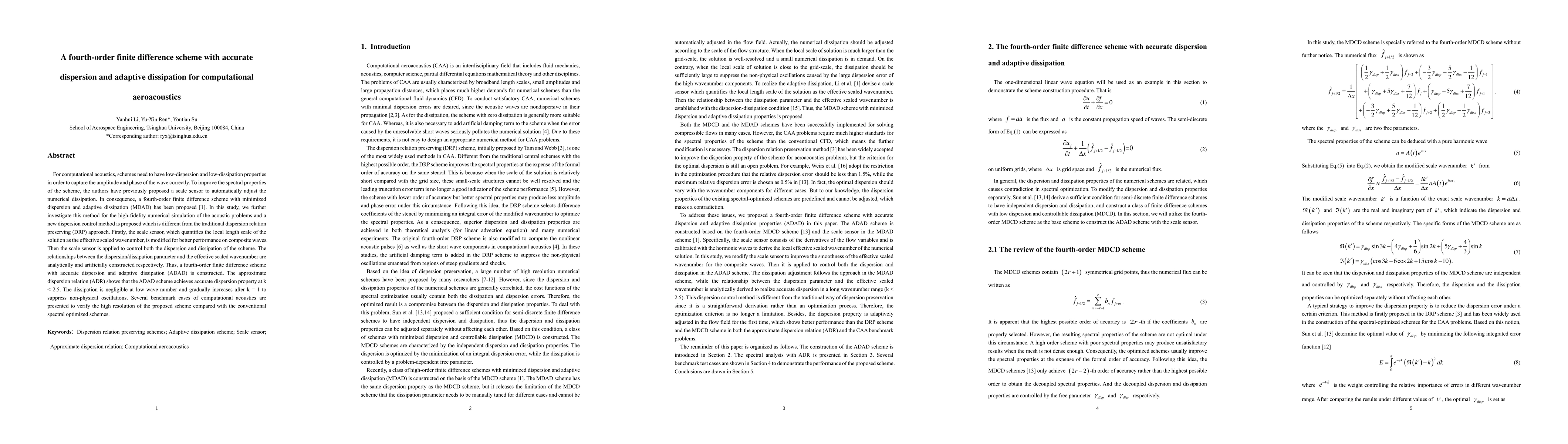 A new finite difference scheme is proposed for computational aeroacoustics with accurate dispersion and adaptive dissipation, achieving high resolution and suppressing non-physical oscillations in acoustic simulations.