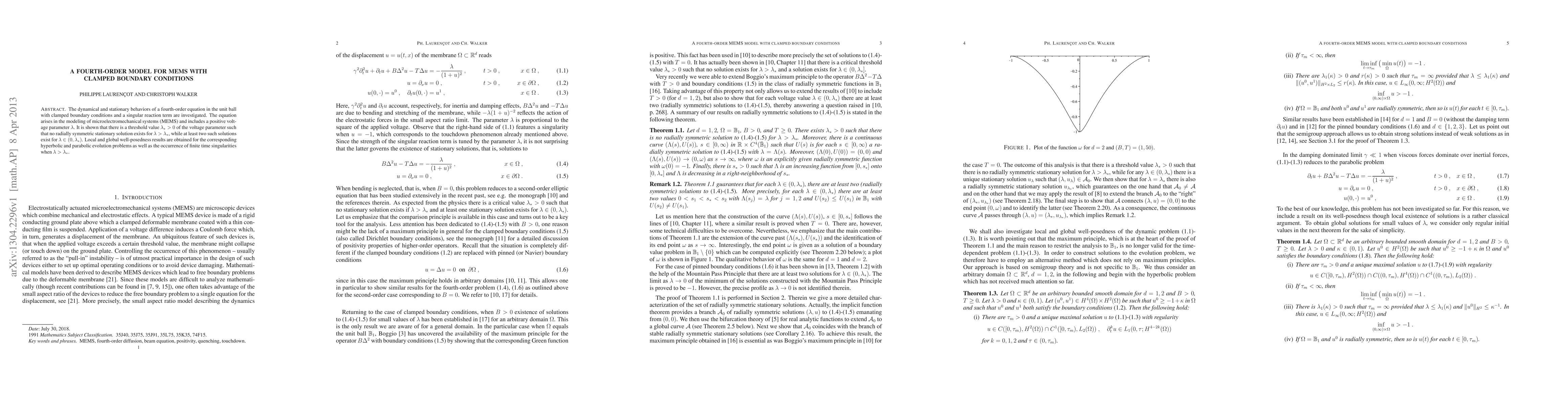 This paper investigates a fourth-order model for MEMS with clamped boundary conditions, revealing that a critical voltage parameter $\lambda_*$ determines the existence of radially symmetric stationary solutions. For $\lambda>\lambda_*$, no such solutions exist, while for $\lambda\in (0,\lambda_*)$, at least two solutions are present. The study also covers local and global well-posedness and finite time singularities.