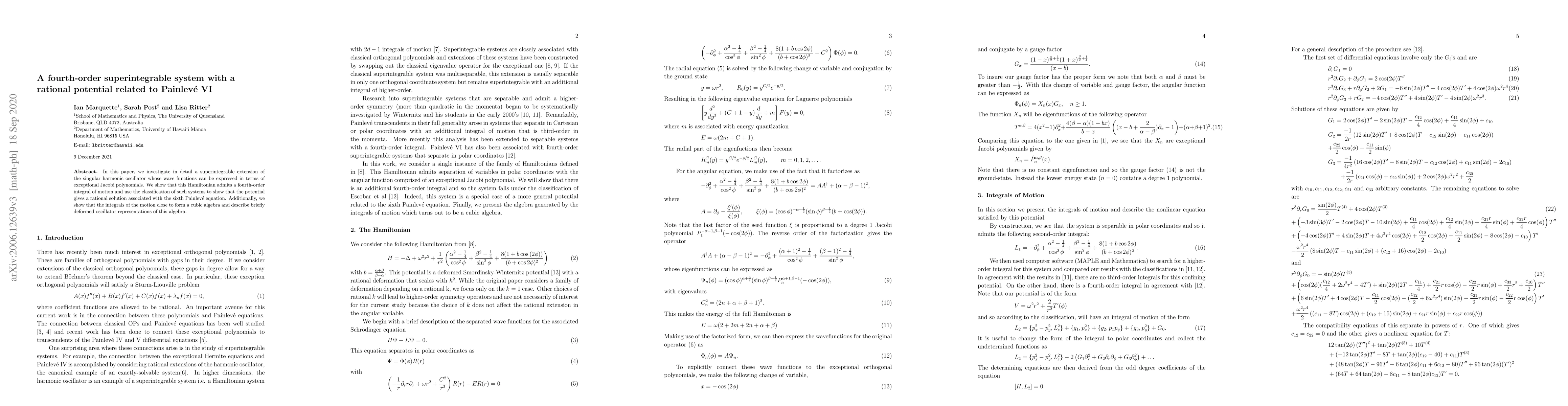In this paper, we investigate in detail a superintegrable extension of the singular harmonic oscillator whose wave functions can be expressed in terms of exceptional Jacobi polynomials. We show that this Hamiltonian admits a fourth-order integral of motion and use the classification of such systems to show that the potential gives a rational solution associated with the sixth Painlev\'e equation. Additionally, we show that the integrals of the motion close to form a cubic algebra and describe briefly deformed oscillator representations of this algebra.