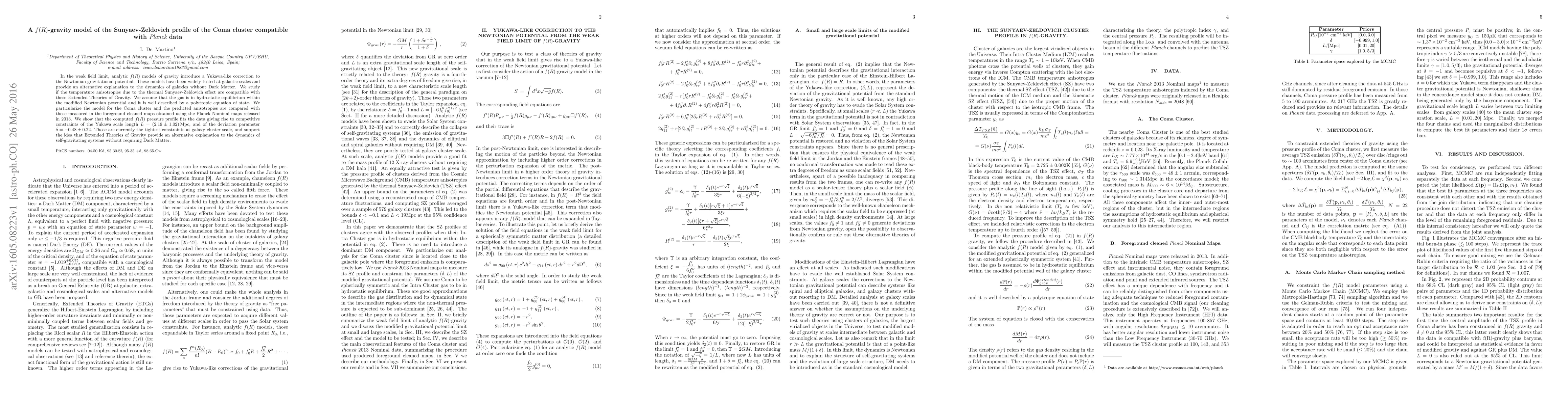 In the weak field limit, analytic $f(R)$ models of gravity introduce a Yukawa-like correction to the Newtonian gravitational potential. These models have been widely tested at galactic scales and provide an alternative explanation to the dynamics of galaxies without Dark Matter. We study if the temperature anisotropies due to the thermal Sunyaev-Zeldovich effect are compatible with these Extended Theories of Gravity. We assume that the gas is in hydrostatic equilibrium within the modified Newtonian potential and it is well described by a polytropic equation of state. We particularize the model for the Coma cluster and the predicted anisotropies are compared with those measured in the foreground cleaned maps obtained using the Planck Nominal maps released in 2013. We show that the computed $f(R)$ pressure profile fits the data giving rise to competitive constraints of the Yukawa scale length $L=(2.19\pm1.02) \rm{\, Mpc}$, and of the deviation parameter $ \delta=-0.48\pm0.22$. Those are currently the tightest constraints at galaxy cluster scale, and support the idea that Extended Theories of Gravity provide an alternative explanation to the dynamics of self-gravitating systems without requiring Dark Matter.