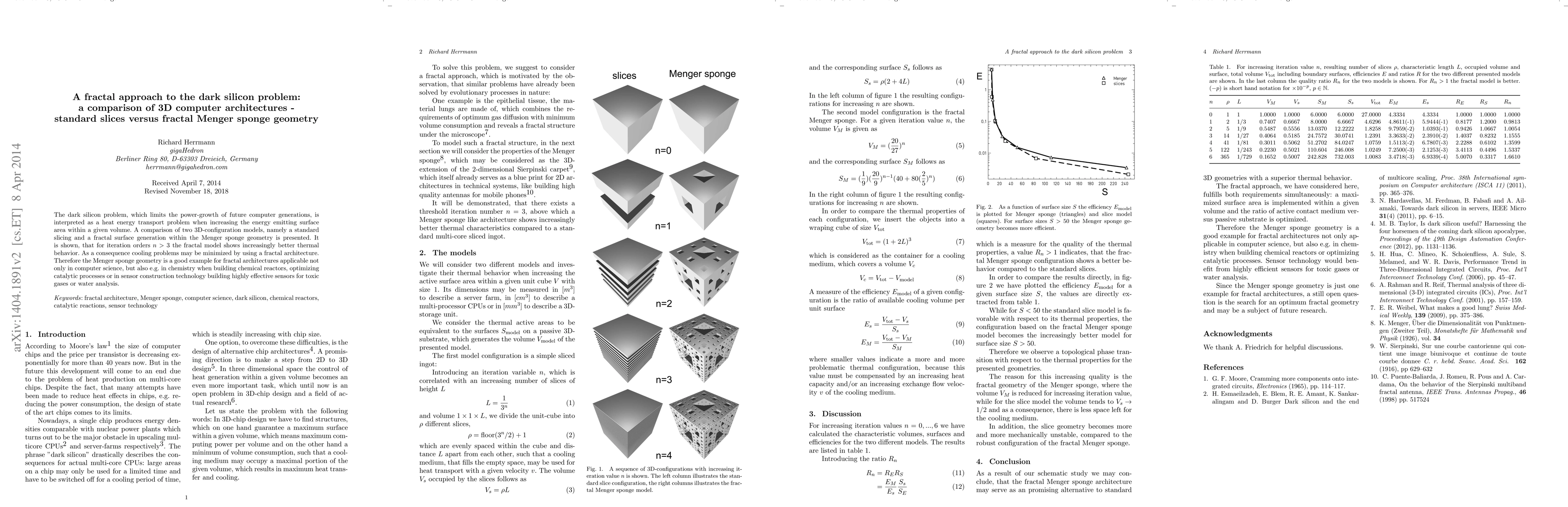 The dark silicon problem, which limits the power-growth of future computer generations, is interpreted as a heat energy transport problem when increasing the energy emitting surface area within a given volume. A comparison of two 3D-configuration models, namely a standard slicing and a fractal surface generation within the Menger sponge geometry is presented. It is shown, that for iteration orders $n>3$ the fractal model shows increasingly better thermal behavior. As a consequence cooling problems may be minimized by using a fractal architecture. Therefore the Menger sponge geometry is a good example for fractal architectures applicable not only in computer science, but also e.g. in chemistry when building chemical reactors, optimizing catalytic processes or in sensor construction technology building highly effective sensors for toxic gases or water analysis.