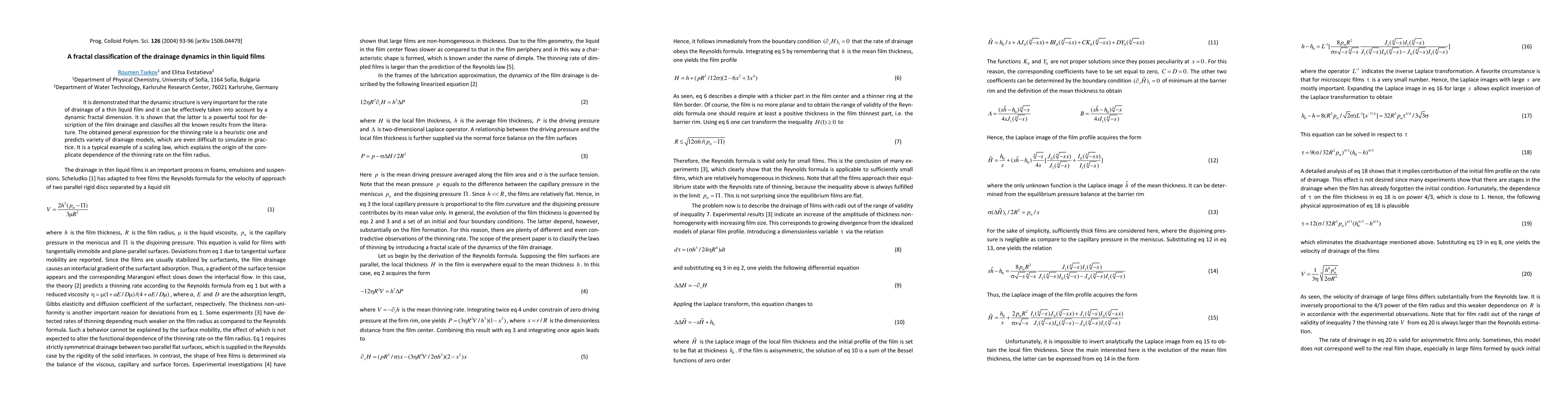 It is demonstrated that the dynamic structure is very important for the rate of drainage of a thin liquid film and it can be effectively taken into account by a dynamic fractal dimension. It is shown that the latter is a powerful tool for description of the film drainage and classifies all the known results from the literature. The obtained general expression for the thinning rate is a heuristic one and predicts variety of drainage models, which are even difficult to simulate in practice. It is a typical example of a scaling law, which explains the origin of the complicate dependence of the thinning rate on the film radius.