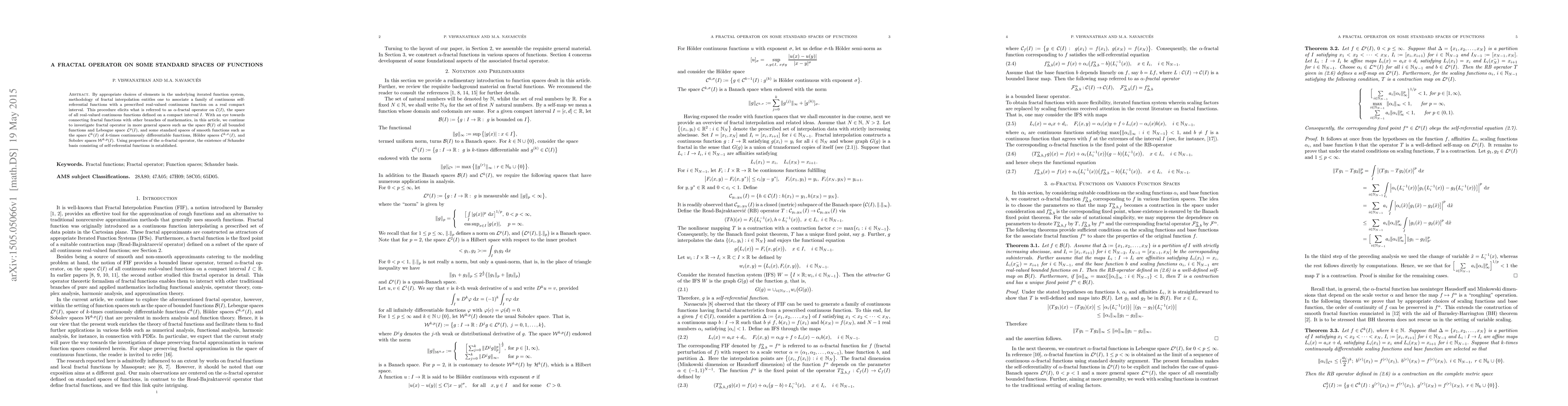 By appropriate choices of elements in the underlying iterated function system, methodology of fractal interpolation entitles one to associate a family of continuous self-referential functions with a prescribed real-valued continuous function on a real compact interval. This procedure elicits what is referred to as $\alpha$-fractal operator on $\mathcal{C}(I)$, the space of all real-valued continuous functions defined on a compact interval $I$. With an eye towards connecting fractal functions with other branches of mathematics, in this article, we continue to investigate fractal operator in more general spaces such as the space $\mathcal{B}(I)$ of all bounded functions and Lebesgue space $\mathcal{L}^p(I)$, and some standard spaces of smooth functions such as the space $\mathcal{C}^k(I)$ of $k$-times continuously differentiable functions, H\"{o}lder spaces $\mathcal{C}^{k,\sigma}(I)$, and Sobolev spaces $\mathcal{W}^{k,p}(I)$. Using properties of the $\alpha$-fractal operator, the existence of Schauder basis consisting of self-referential functions is established.