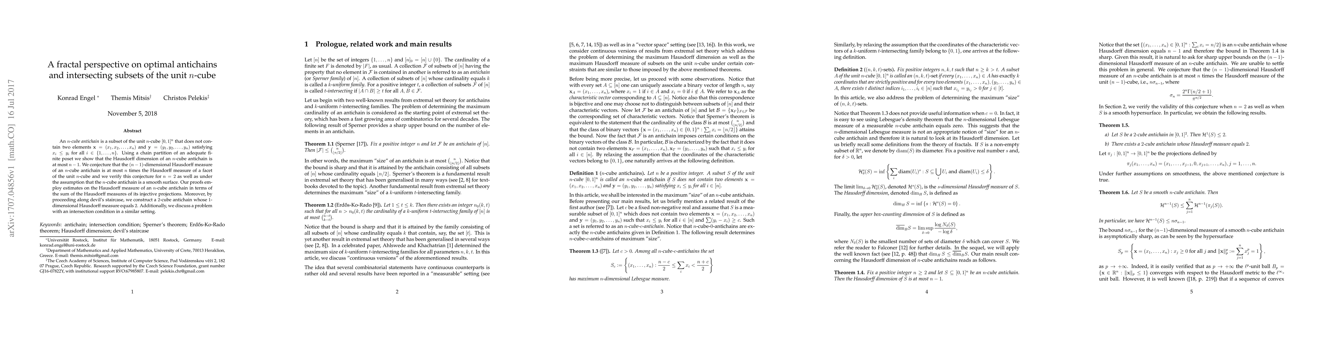 This paper examines the Hausdorff dimension and measure of optimal antichains within the unit $n$-cube, proving their dimension is at most $n-1$. It conjectures an upper bound for the $(n-1)$-dimensional measure and verifies it for $n=2$ and smooth antichains, employing projections and a construction for a $2$-cube antichain.