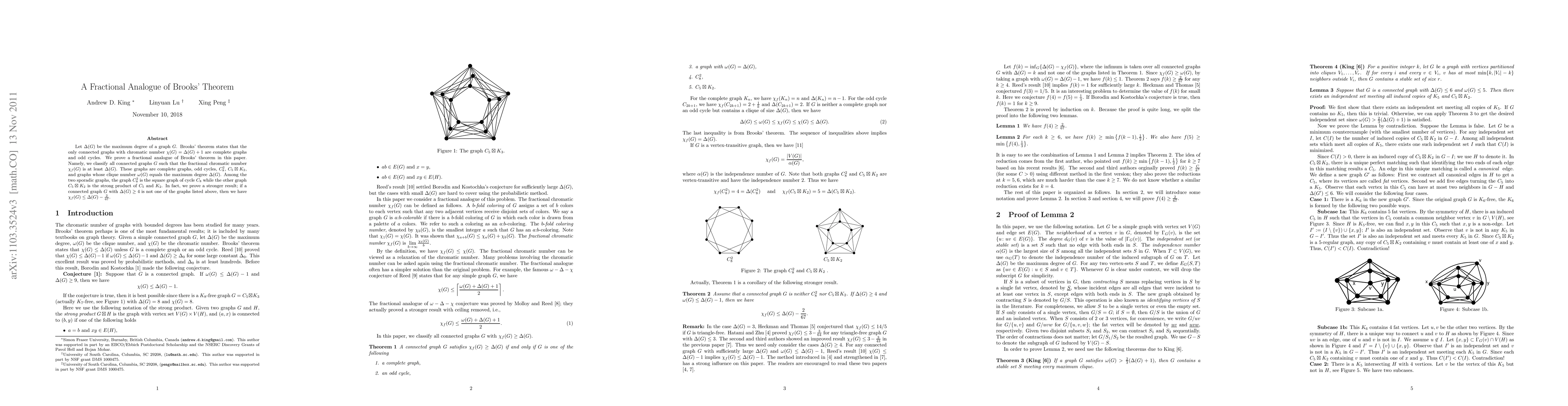 This paper proves a fractional analogue of Brooks' theorem, classifying connected graphs where the fractional chromatic number $\chi_f(G)$ is at least $\Delta(G)$. The identified graphs include complete graphs, odd cycles, $C^2_8$, $C_5\boxtimes K_2$, and those with $\omega(G) = \Delta(G)$.