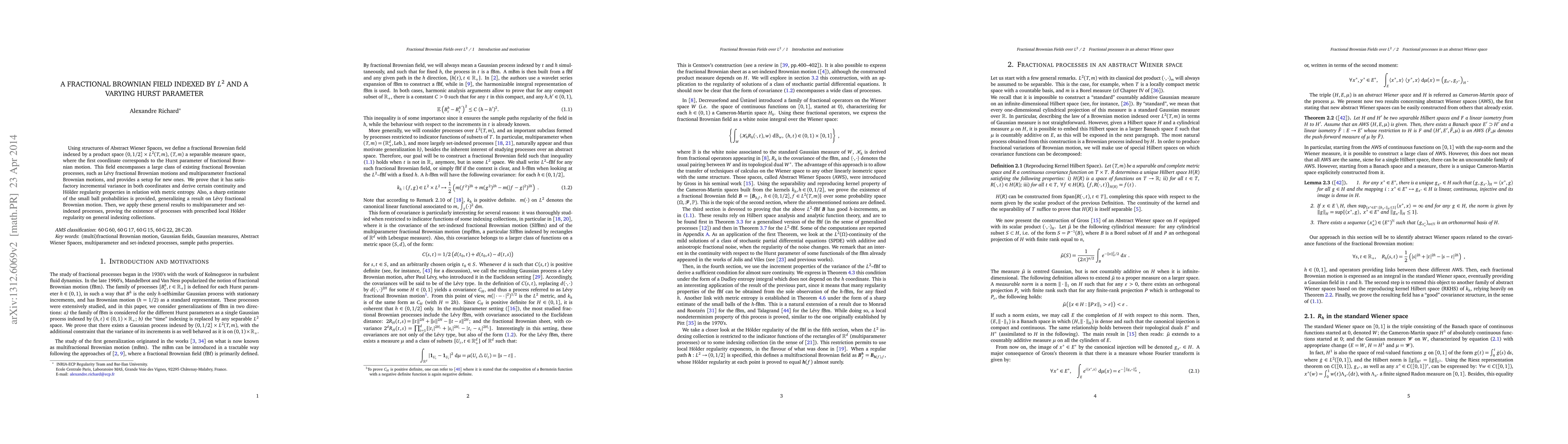 Using structures of Abstract Wiener Spaces, we define a fractional Brownian field indexed by a product space $(0,1/2] \times L^2(T,m)$, $(T,m)$ a separable measure space, where the first coordinate corresponds to the Hurst parameter of fractional Brownian motion. This field encompasses a large class of existing fractional Brownian processes, such as L\'evy fractional Brownian motions and multiparameter fractional Brownian motions, and provides a setup for new ones. We prove that it has satisfactory incremental variance in both coordinates and derive certain continuity and H\"older regularity properties in relation with metric entropy. Also, a sharp estimate of the small ball probabilities is provided, generalizing a result on L\'evy fractional Brownian motion. Then, we apply these general results to multiparameter and set-indexed processes, proving the existence of processes with prescribed local H\"older regularity on general indexing collections.