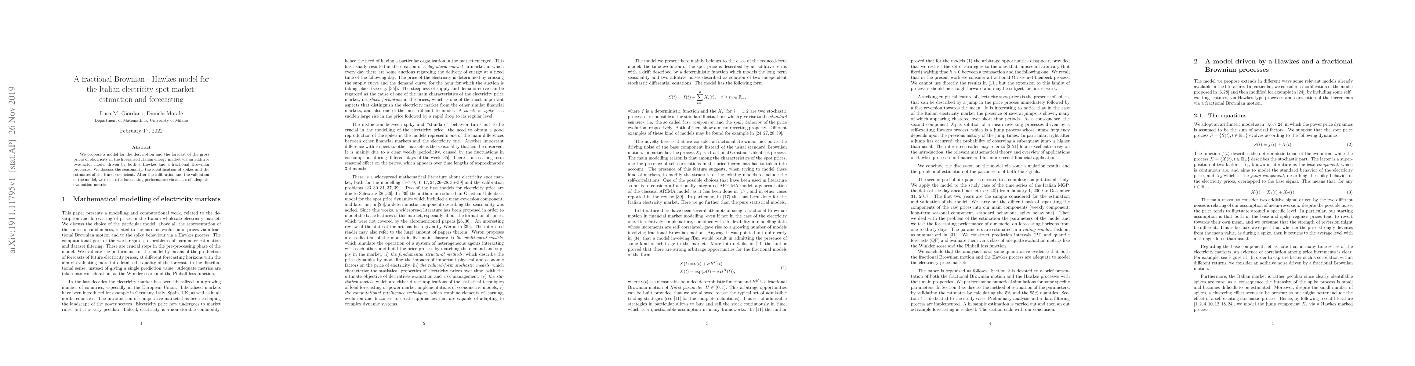This paper proposes a two-factor model combining fractional Brownian motion and Hawkes processes to forecast gross electricity prices in Italy's liberalized market. The model addresses seasonality, spike identification, and Hurst coefficient estimation, followed by validation and evaluation of its forecasting performance.