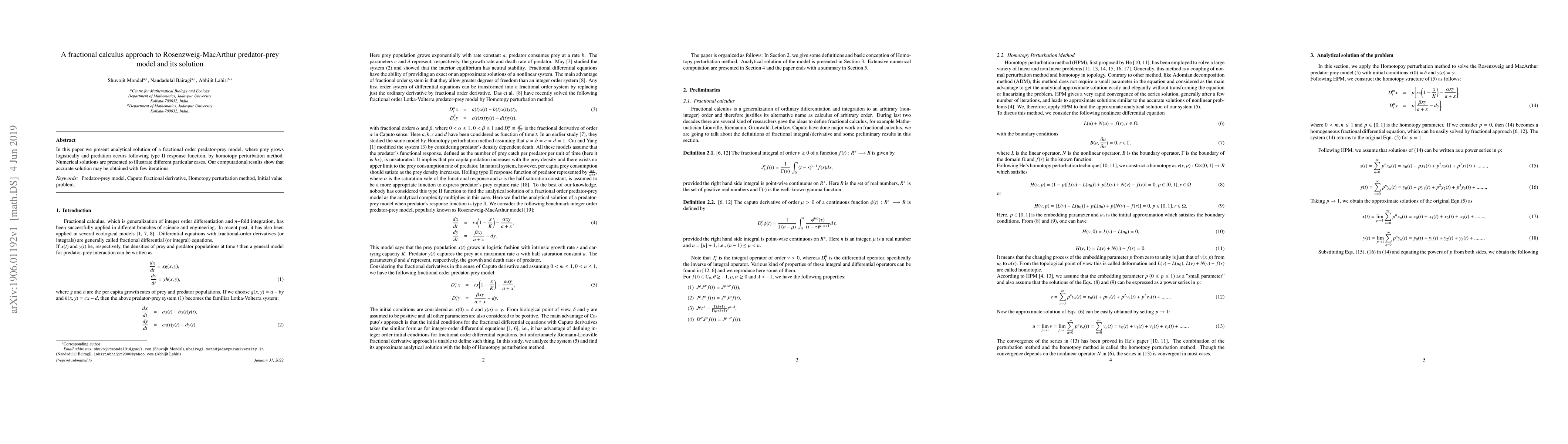 This paper presents an analytical solution for a fractional calculus-based Rosenzweig-MacArthur predator-prey model using the homotopy perturbation method. Numerical solutions demonstrate accurate results with minimal iterations.