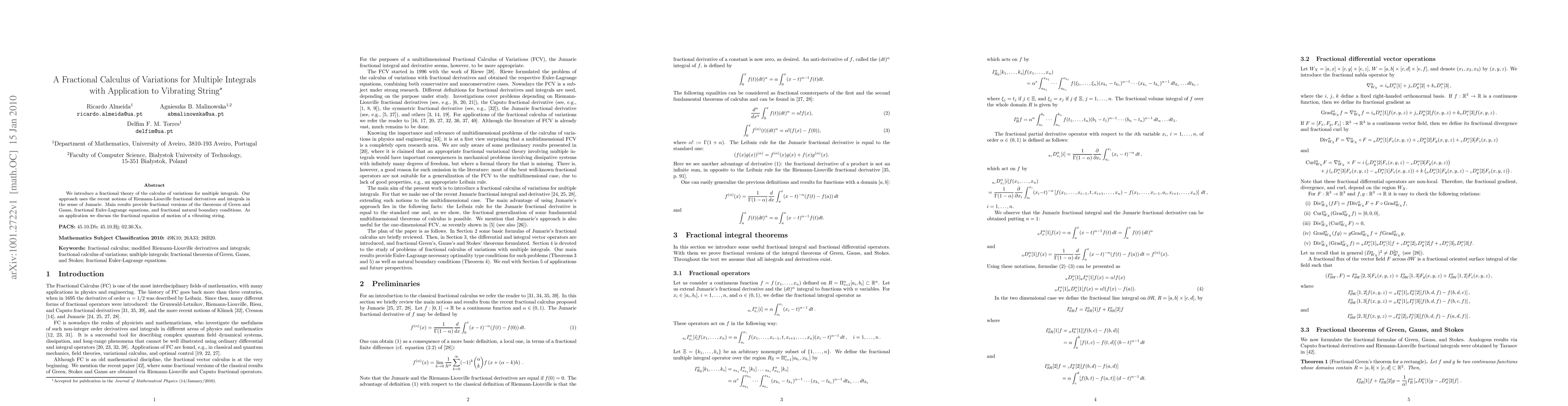 This paper develops a fractional calculus of variations for multiple integrals, utilizing Riemann-Liouville fractional derivatives. It derives fractional versions of classical theorems and Euler-Lagrange equations, and applies these to derive the fractional equation of motion for a vibrating string.