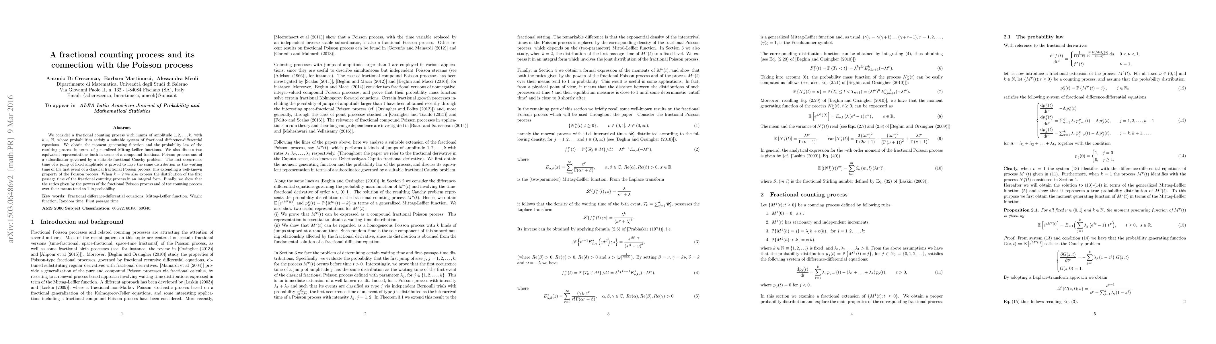 This paper explores a fractional counting process with jumps of various amplitudes, deriving its moment generating function and probability law using generalized Mittag-Leffler functions. It establishes equivalences with a compound fractional Poisson process and a subordinator governed by a fractional Cauchy problem, extending properties of the classical Poisson process to the fractional case.