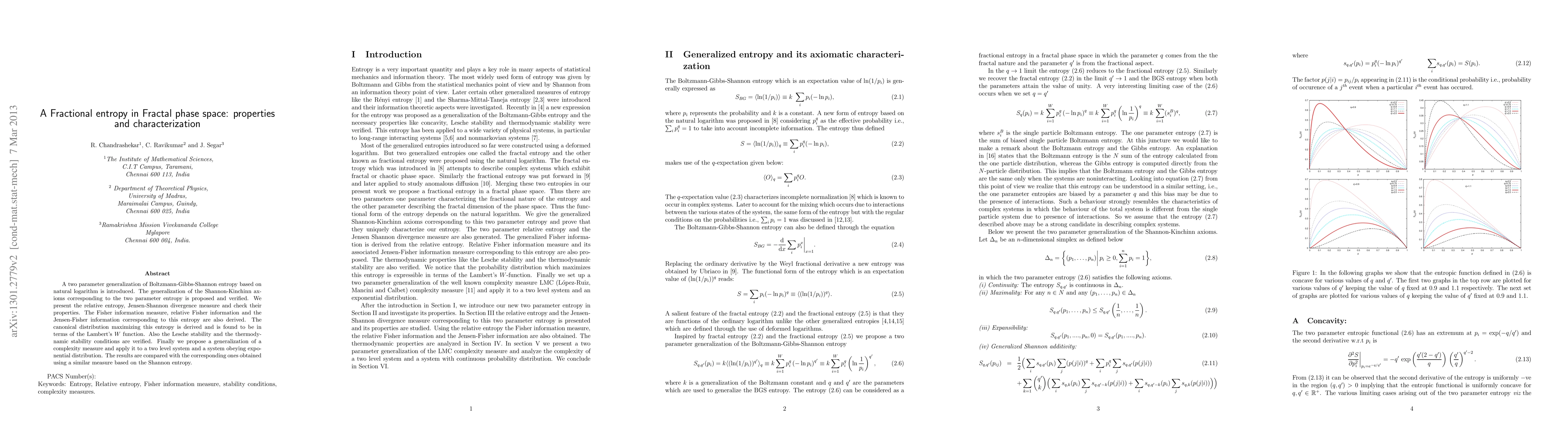 A two parameter generalization of Boltzmann-Gibbs-Shannon entropy based on natural logarithm is introduced. The generalization of the Shannon-Kinchinn axioms corresponding to the two parameter entropy is proposed and verified. We present the relative entropy, Jensen-Shannon divergence measure and check their properties. The Fisher information measure, relative Fisher information and the Jensen-Fisher information corresponding to this entropy are also derived. The canonical distribution maximizing this entropy is derived and is found to be in terms of the Lambert's W function. Also the Lesche stability and the thermodynamic stability conditions are verified. Finally we propose a generalization of a complexity measure and apply it to a two level system and a system obeying exponential distribution. The results are compared with the corresponding ones obtained using a similar measure based on the Shannon entropy.