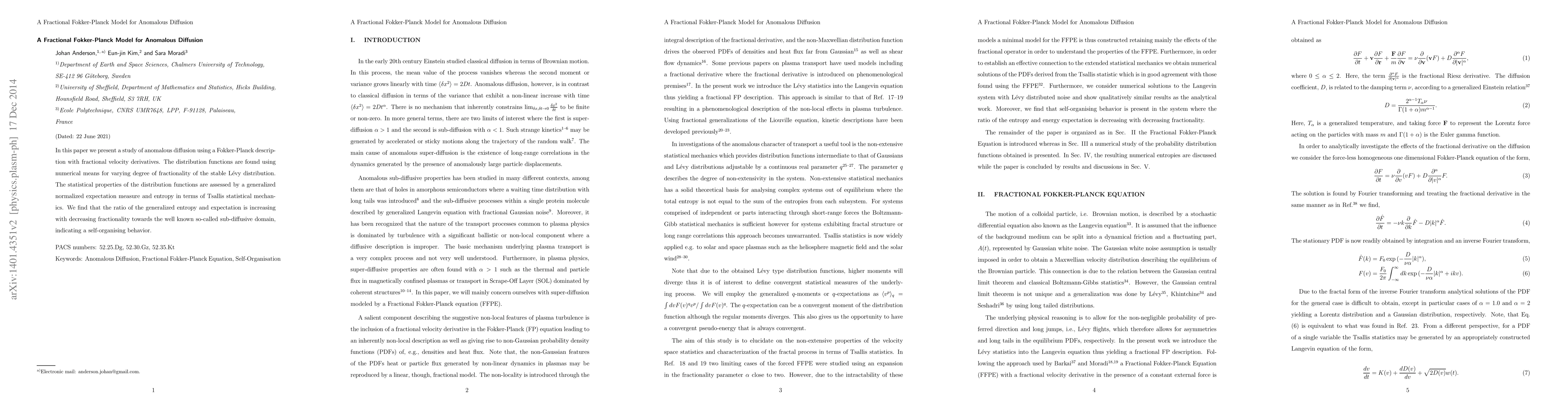 In this paper we present a study of anomalous diffusion using a Fokker-Planck description with fractional velocity derivatives. The distribution functions are found using numerical means for varying degree of fractionality observing the transition from a Gaussian distribution to a L\'evy distribution. The statistical properties of the distribution functions are assessed by a generalized expectation measure and entropy in terms of Tsallis statistical mechanics. We find that the ratio of the generalized entropy and expectation is increasing with decreasing fractionality towards the well known so-called sub-diffusive domain, indicating a self-organising behavior.