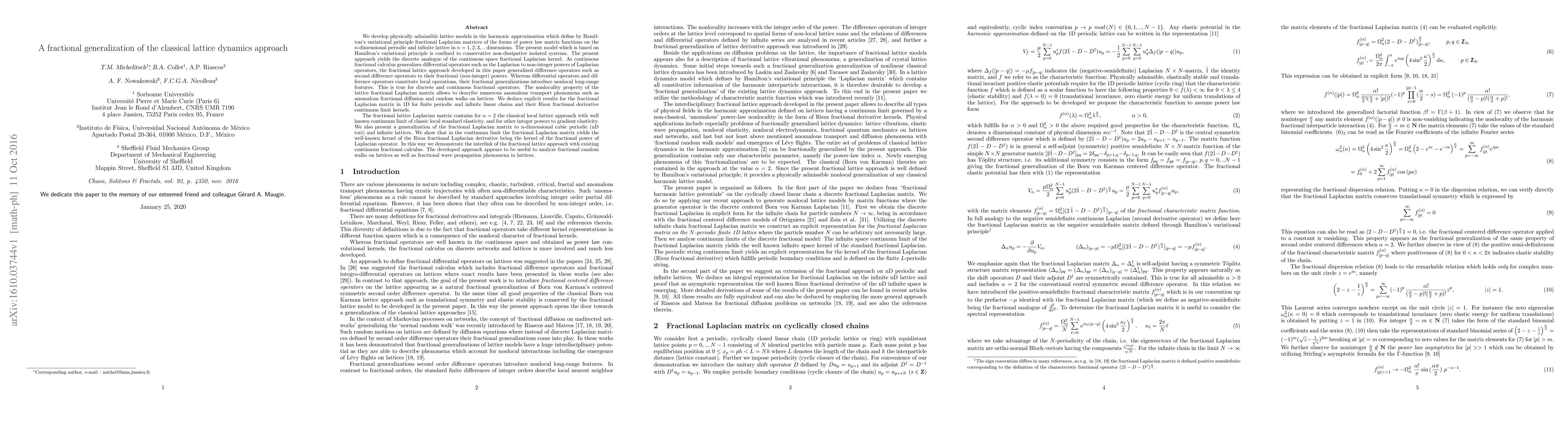This paper introduces a fractional generalization of classical lattice dynamics, employing Hamilton's variational principle to define fractional Laplacian matrices as power law functions on periodic lattices. This non-dissipative approach introduces nonlocal long-range features, useful for modeling anomalous diffusion and random walks on lattices.