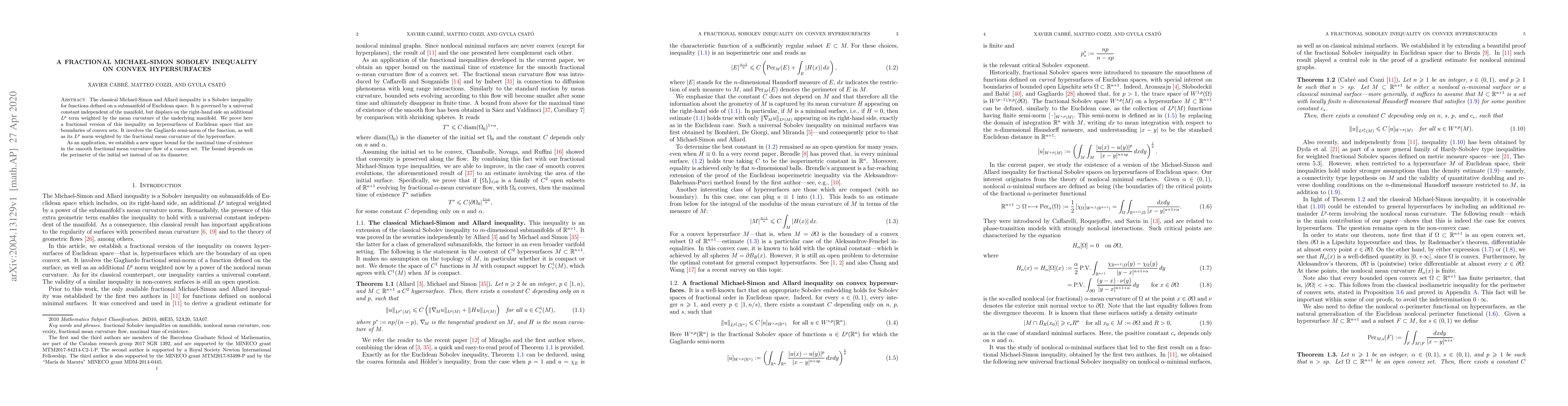 This paper proves a fractional version of the Michael-Simon Sobolev inequality on convex hypersurfaces, incorporating the Gagliardo semi-norm and fractional mean curvature. It also provides a new upper bound for the maximal time of existence in the smooth fractional mean curvature flow, dependent on the perimeter rather than the diameter of the initial set.