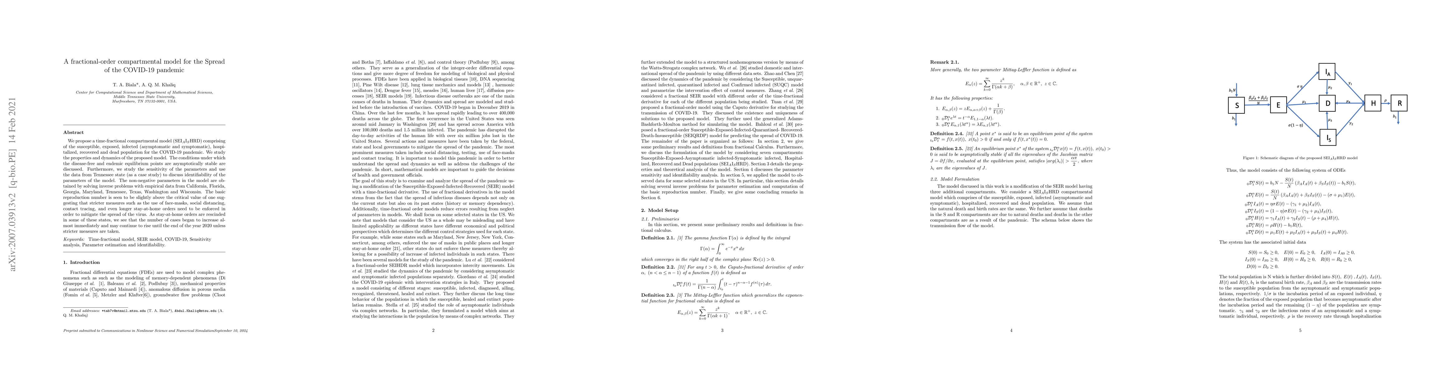 We propose a time-fractional compartmental model (SEI$_A$I$_S$HRD) comprising of the susceptible, exposed, infected (asymptomatic and symptomatic), hospitalized, recovered and dead population for the Covid-19 pandemic. We study the properties and dynamics of the proposed model. The conditions under which the disease-free and endemic equilibrium points are asymptotically stable are discussed. Furthermore, we study the sensitivity of the parameters and use the data from Tennessee state (as a case study) to discuss identifiability of the parameters of the model. The non-negative parameters in the model are obtained by solving inverse problems with empirical data from California, Florida, Georgia, Maryland, Tennessee, Texas, Washington and Wisconsin. The basic reproduction number is seen to be slightly above the critical value of one suggesting that stricter measures such as the use of face-masks, social distancing, contact tracing, and even longer stay-at-home orders need to be enforced in order to mitigate the spread of the virus. As stay-at-home orders are rescinded in some of these states, we see that the number of cases began to increase almost immediately and may continue to rise until the end of the year 2020 unless stricter measures are taken.