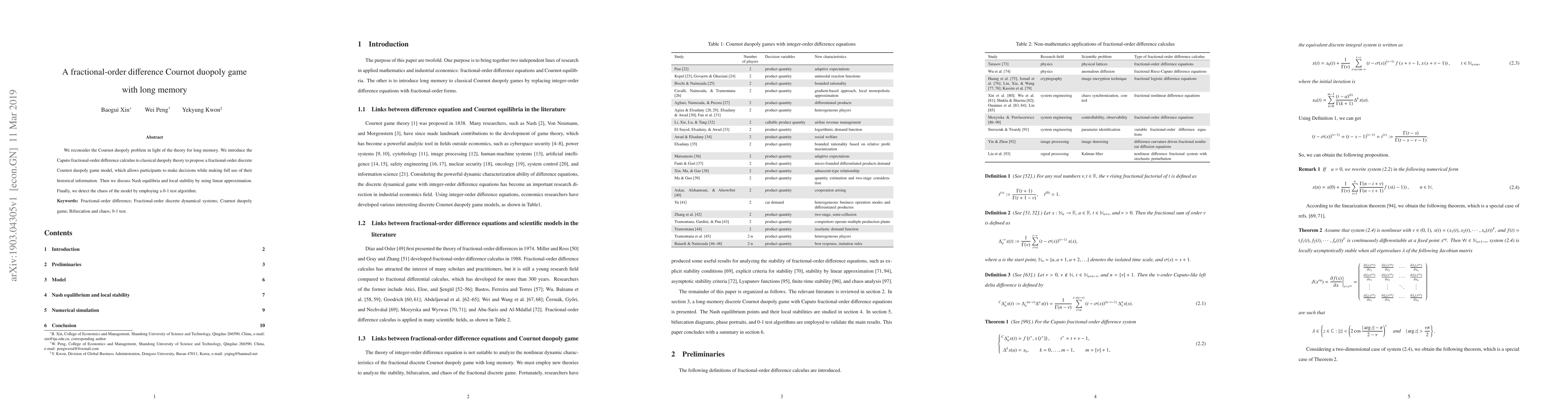 This paper proposes a fractional-order difference Cournot duopoly game model incorporating long memory via Caputo fractional-order difference calculus. It explores Nash equilibria, local stability, and chaos detection using a 0-1 test algorithm.