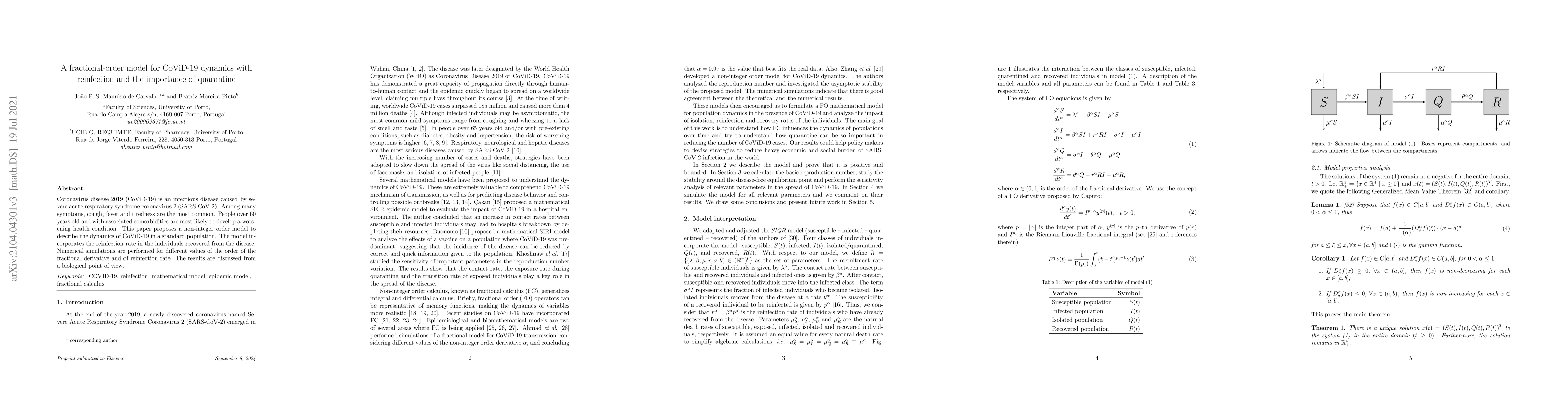 Coronavirus disease 2019 (CoViD-19) is an infectious disease caused by severe acute respiratory syndrome coronavirus 2 (SARS-CoV-2). Among many symptoms, cough, fever and tiredness are the most common. People over 60 years old and with associated comorbidities are most likely to develop a worsening health condition. This paper proposes a non-integer order model to describe the dynamics of CoViD-19 in a standard population. The model incorporates the reinfection rate in the individuals recovered from the disease. Numerical simulations are performed for different values of the order of the fractional derivative and of reinfection rate. The results are discussed from a biological point of view.