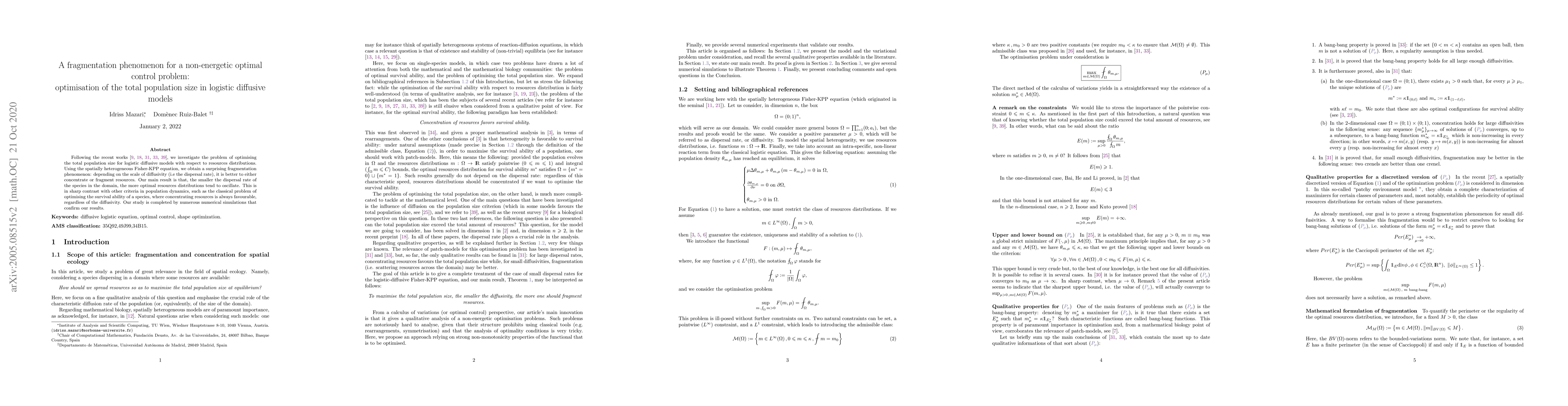 Following some recent works, we investigate the problem of optimising the total population size for logistic diffusive models with respect to resources distributions. Using the spatially heterogeneous Fisher-KPP equation, we obtain a surprising fragmentation phenomenon: depending on the scale of diffusivity (i.e the dispersal rate), it is better to either concentrate or fragment resources. Our main result is that, the smaller the dispersal rate of the species in the domain, the more optimal resources distributions tend to oscillate. This is in sharp contrast with other criteria in population dynamics, such as the classical problem of optimising the survival ability of a species, where concentrating resources is always favourable, regardless of the diffusivity. Our study is completed by numerous numerical simulations that confirm our results.