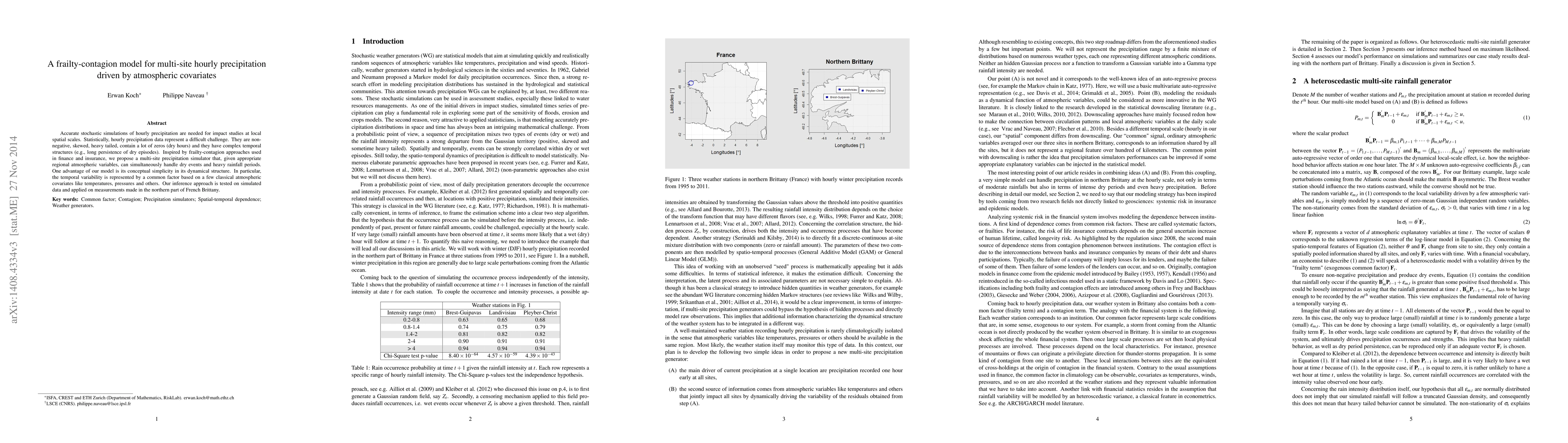 Accurate stochastic simulations of hourly precipitation are needed for impact studies at local spatial scales. Statistically, hourly precipitation data represent a difficult challenge. They are non-negative, skewed, heavy tailed, contain a lot of zeros (dry hours) and they have complex temporal structures (e.g., long persistence of dry episodes). Inspired by frailty-contagion approaches used in finance and insurance, we propose a multi-site precipitation simulator that, given appropriate regional atmospheric variables, can simultaneously handle dry events and heavy rainfall periods. One advantage of our model is its conceptual simplicity in its dynamical structure. In particular, the temporal variability is represented by a common factor based on a few classical atmospheric covariates like temperatures, pressures and others. Our inference approach is tested on simulated data and applied on measurements made in the northern part of French Brittany.