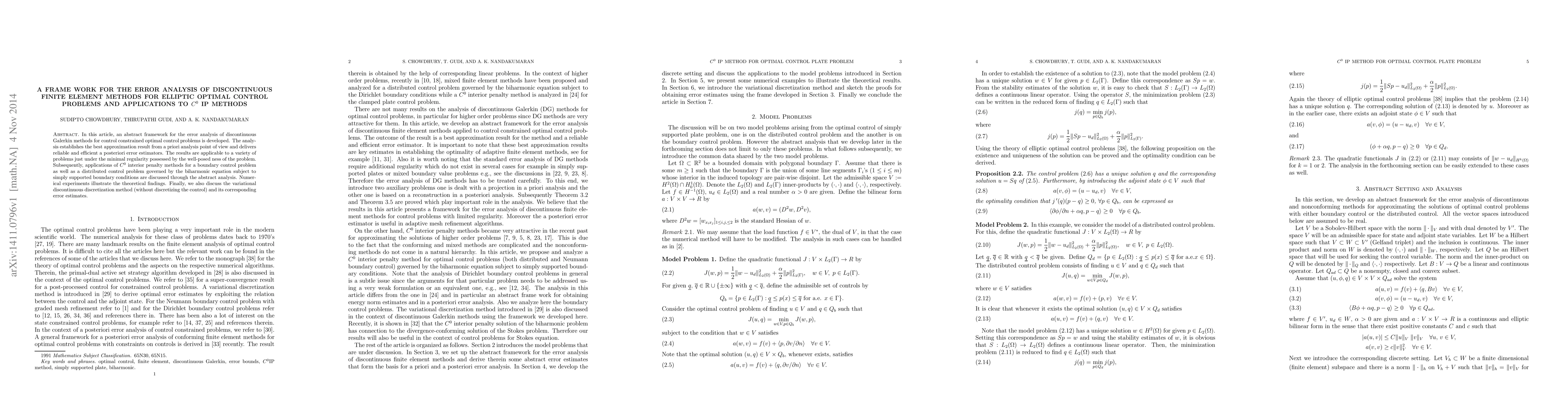 In this article, an abstract framework for the error analysis of discontinuous Galerkin methods for control constrained optimal control problems is developed. The analysis establishes the best approximation result from a priori analysis point of view and delivers reliable and efficient a posteriori error estimators. The results are applicable to a variety of problems just under the minimal regularity possessed by the well-posed ness of the problem. Subsequently, applications of $C^0$ interior penalty methods for a boundary control problem as well as a distributed control problem governed by the biharmonic equation subject to simply supported boundary conditions are discussed through the abstract analysis. Numerical experiments illustrate the theoretical findings. Finally, we also discuss the variational discontinuous discretization method (without discretizing the control) and its corresponding error estimates.