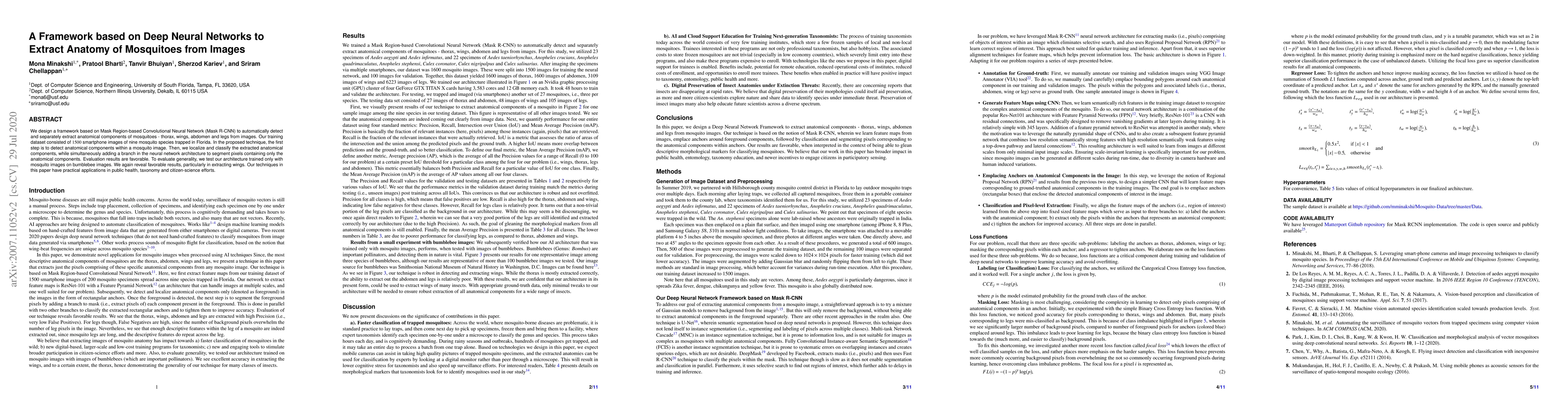 We design a framework based on Mask Region-based Convolutional Neural Network (Mask R-CNN) to automatically detect and separately extract anatomical components of mosquitoes - thorax, wings, abdomen and legs from images. Our training dataset consisted of 1500 smartphone images of nine mosquito species trapped in Florida. In the proposed technique, the first step is to detect anatomical components within a mosquito image. Then, we localize and classify the extracted anatomical components, while simultaneously adding a branch in the neural network architecture to segment pixels containing only the anatomical components. Evaluation results are favorable. To evaluate generality, we test our architecture trained only with mosquito images on bumblebee images. We again reveal favorable results, particularly in extracting wings. Our techniques in this paper have practical applications in public health, taxonomy and citizen-science efforts.