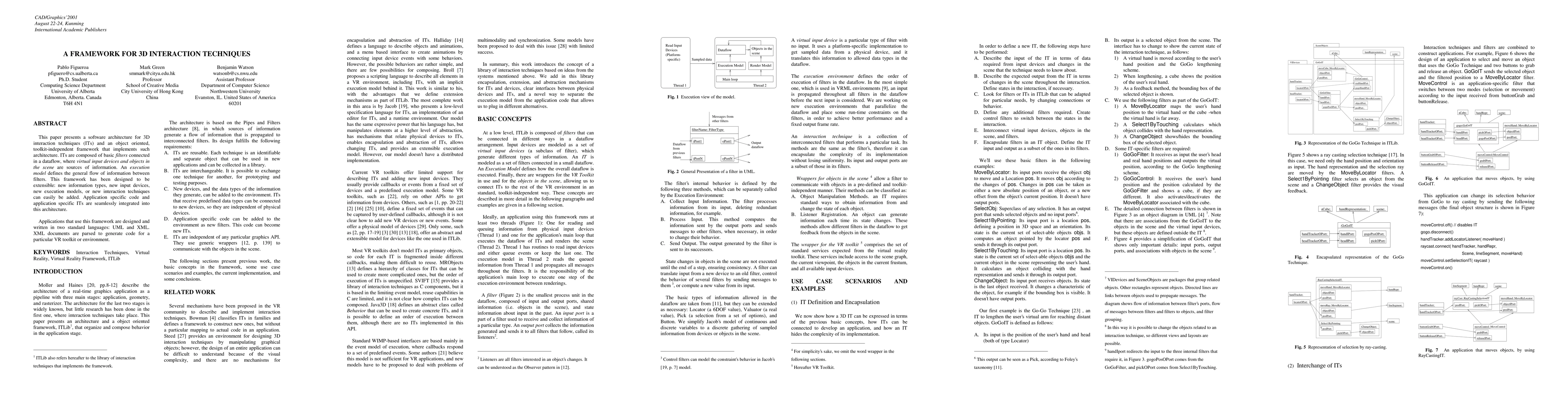 This paper presents a software architecture for 3D interaction techniques (ITs) and an object oriented, toolkit-independent framework that implements such architecture. ITs are composed of basic filters connected in a dataflow, where virtual input devices and objects in the scene are sources of information. An execution model defines the general flow of information between filters. This framework has been designed to be extensible: new information types, new input devices, new execution models, or new interaction techniques can easily be added. Application specific code and application specific ITs are seamlessly integrated into this architecture.
