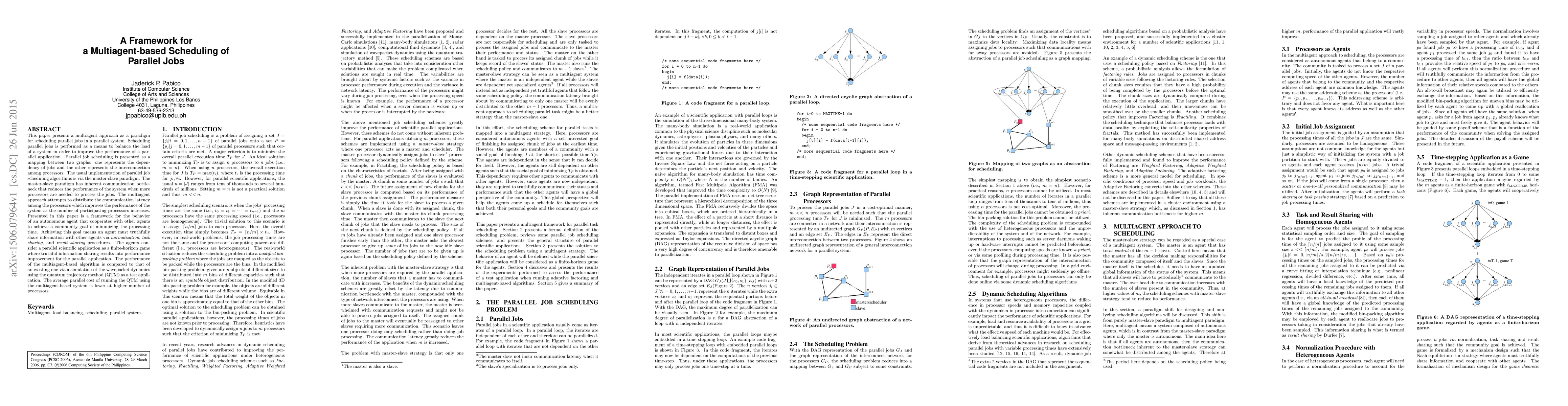This paper presents a multiagent approach as a paradigm for scheduling parallel jobs in a parallel system. Scheduling parallel jobs is performed as a means to balance the load of a system in order to improve the performance of a parallel application. Parallel job scheduling is presented as a mapping between two graphs: one represents the dependency of jobs and the other represents the interconnection among processors. The usual implementation of parallel job scheduling algorithms is via the master-slave paradigm. The master-slave paradigm has inherent communication bottleneck that reduces the performance of the system when more processors are needed to process the jobs. The multiagent approach attempts to distribute the communication latency among the processors which improves the performance of the system as the number of participating processors increases. Presented in this paper is a framework for the behavior of an autonomous agent that cooperates with other agents to achieve a community goal of minimizing the processing time. Achieving this goal means an agent must truthfully share information with other agents via {\em normalization}, {\em task sharing}, and {\em result sharing} procedures. The agents consider a parallel scientific application as a finite-horizon game where truthful information sharing results into performance improvement for the parallel application. The performance of the multiagent-based algorithm is compared to that of an existing one via a simulation of the wavepacket dynamics using the quantum trajectory method (QTM) as a test application. The average parallel cost of running the QTM using the multiagent-based system is lower at higher number of processors.