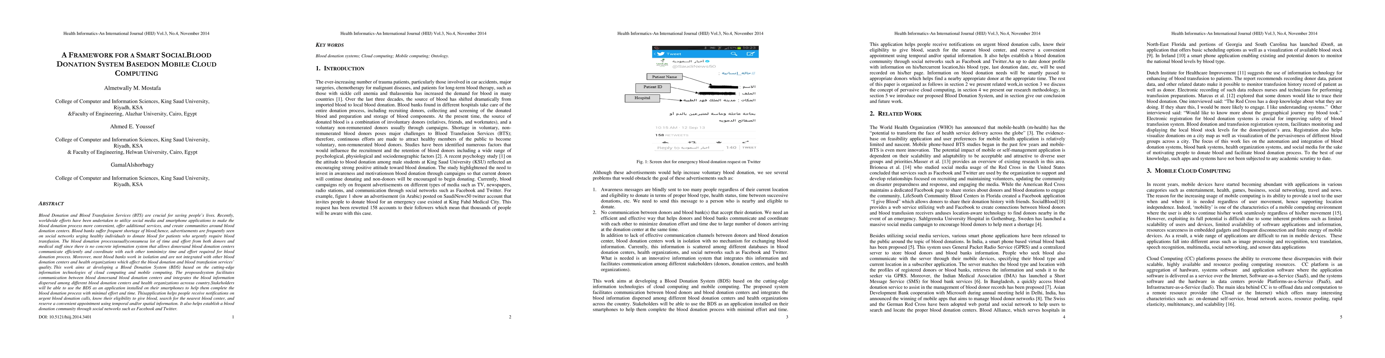 Blood Donation and Blood Transfusion Services (BTS) are crucial for saving people lives. Recently, worldwide efforts have been undertaken to utilize social media and smartphone applications to make the blood donation process more convenient, offer additional services, and create communities around blood donation centers. Blood banks suffer frequent shortage of blood; hence, advertisements are frequently seen on social networks urging healthy individuals to donate blood for patients who urgently require blood transfusion. The blood donation process usually consumes a lot of time and effort from both donors and medical staff since there is no concrete information system that allows donors and blood donation centers communicate efficiently and coordinate with each other to minimize time and effort required for blood donation process. Moreover, most blood banks work in isolation and are not integrated with other blood donation centers and health organizations which affect the blood donation and blood transfusion services quality. This work aims at developing a Blood Donation System (BDS) based on the cutting-edge information technologies of cloud computing and mobile computing.
