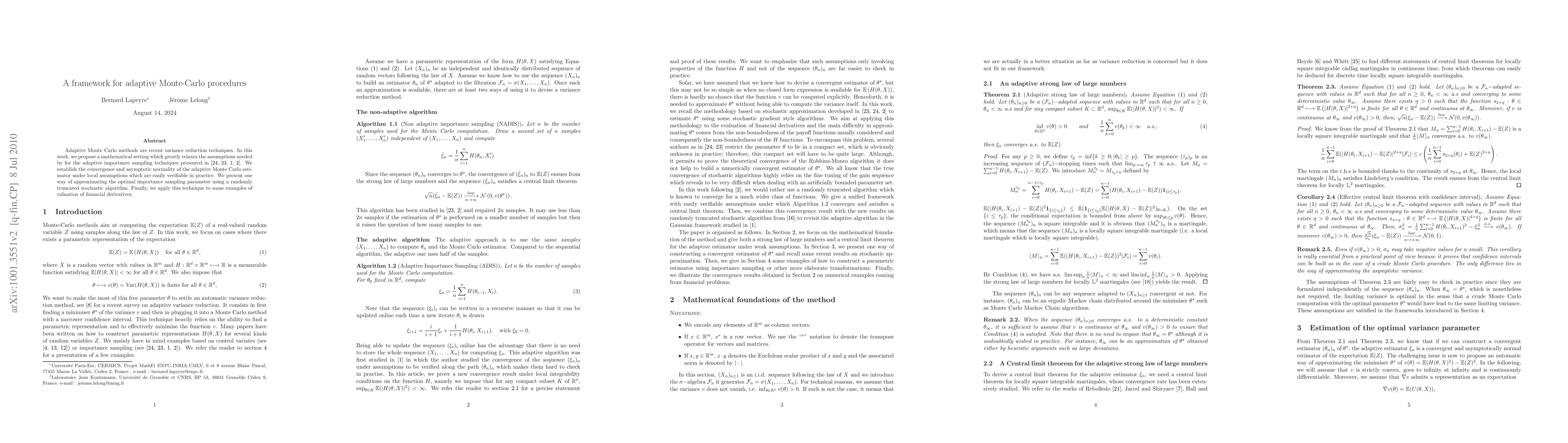 This paper proposes a flexible mathematical framework for adaptive Monte Carlo methods, relaxing previous assumptions and establishing convergence and asymptotic normality. It introduces a stochastic algorithm to approximate the optimal importance sampling parameter and demonstrates its application in valuing financial derivatives.