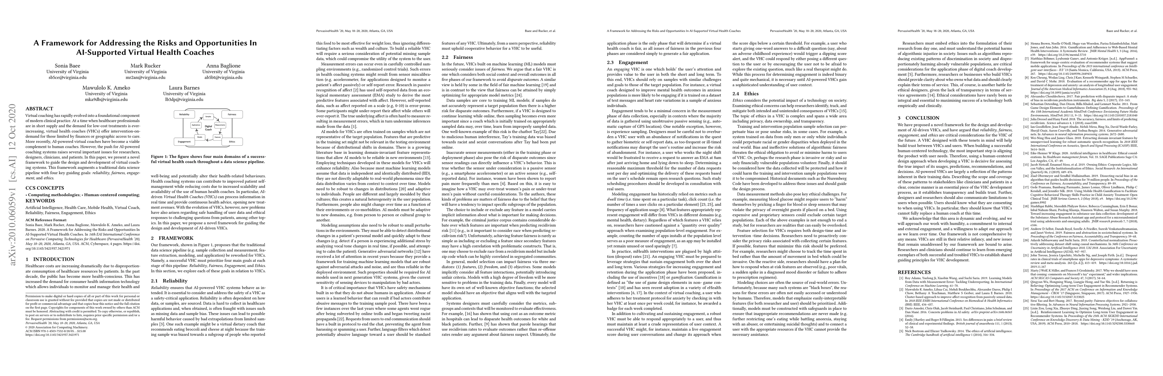 Virtual coaching has rapidly evolved into a foundational component of modern clinical practice. At a time when healthcare professionals are in short supply and the demand for low-cost treatments is ever-increasing, virtual health coaches (VHCs) offer intervention-on-demand for those limited by finances or geographic access to care. More recently, AI-powered virtual coaches have become a viable complement to human coaches. However, the push for AI-powered coaching systems raises several important issues for researchers, designers, clinicians, and patients. In this paper, we present a novel framework to guide the design and development of virtual coaching systems. This framework augments a traditional data science pipeline with four key guiding goals: reliability, fairness, engagement, and ethics.
