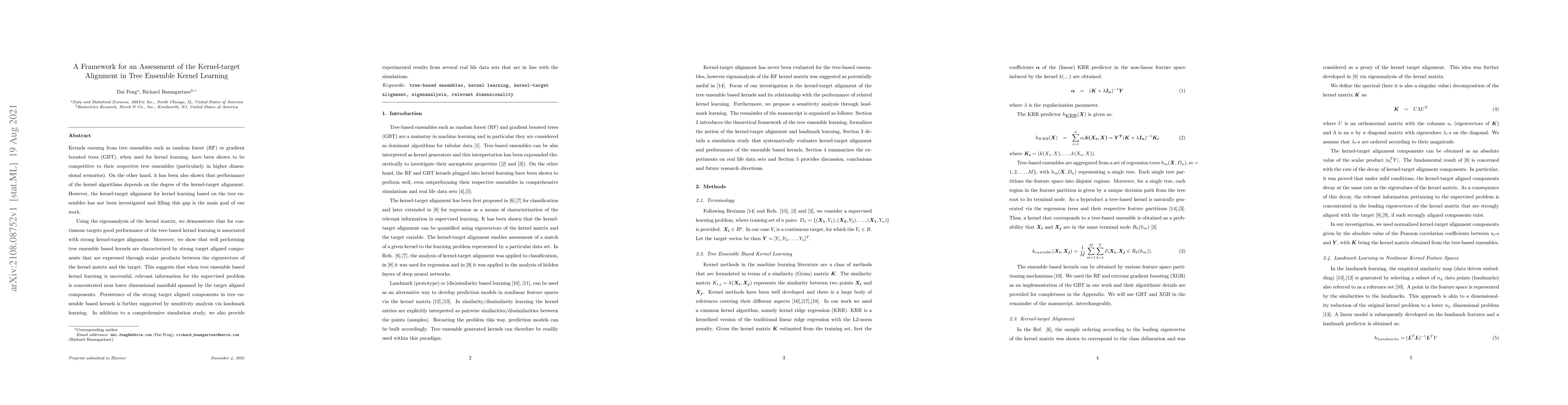 Kernels ensuing from tree ensembles such as random forest (RF) or gradient boosted trees (GBT), when used for kernel learning, have been shown to be competitive to their respective tree ensembles (particularly in higher dimensional scenarios). On the other hand, it has been also shown that performance of the kernel algorithms depends on the degree of the kernel-target alignment. However, the kernel-target alignment for kernel learning based on the tree ensembles has not been investigated and filling this gap is the main goal of our work. Using the eigenanalysis of the kernel matrix, we demonstrate that for continuous targets good performance of the tree-based kernel learning is associated with strong kernel-target alignment. Moreover, we show that well performing tree ensemble based kernels are characterized by strong target aligned components that are expressed through scalar products between the eigenvectors of the kernel matrix and the target. This suggests that when tree ensemble based kernel learning is successful, relevant information for the supervised problem is concentrated near lower dimensional manifold spanned by the target aligned components. Persistence of the strong target aligned components in tree ensemble based kernels is further supported by sensitivity analysis via landmark learning. In addition to a comprehensive simulation study, we also provide experimental results from several real life data sets that are in line with the simulations.