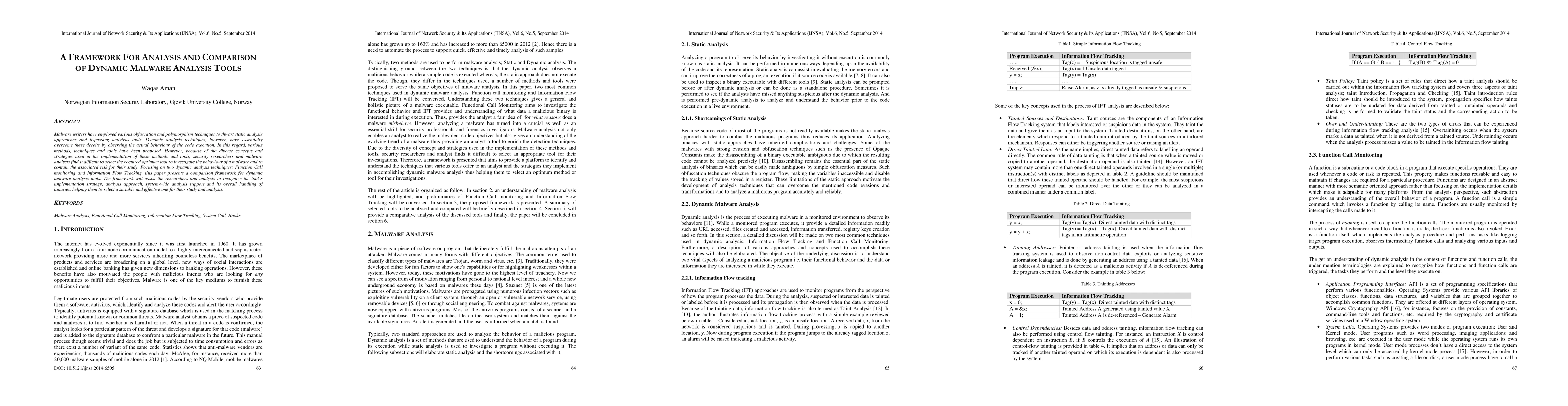 This paper proposes a framework for analyzing and comparing dynamic malware analysis tools, focusing on Function Call Monitoring and Information Flow Tracking. It aims to help researchers and analysts select the most effective tool for investigating malware behavior by evaluating implementation strategies, analysis approaches, and overall system support.