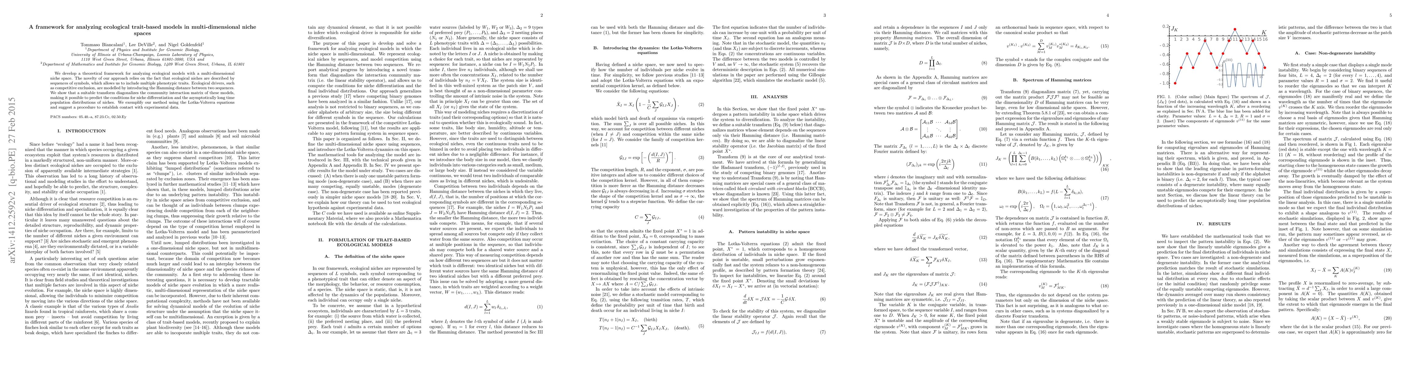 We develop an theoretical approach for predicting biodiversity in multi-dimensional niche spaces, arising due to ecological drivers such as competitive exclusion. The novelty of our approach relies on the fact that ecological niches are described by sequences of strings, which allows us to describe multiple traits. We define the mathematical framework for analyzing pattern forming instabilities in these models, showing surprisingly that the analytic linear theory predicts the asymptotically long time population distributions of niches in the model. We propose a test for identifying ecological drivers in biodiversity distributions, based on representing ecosystem data by means of a certain transform introduced in the theory.