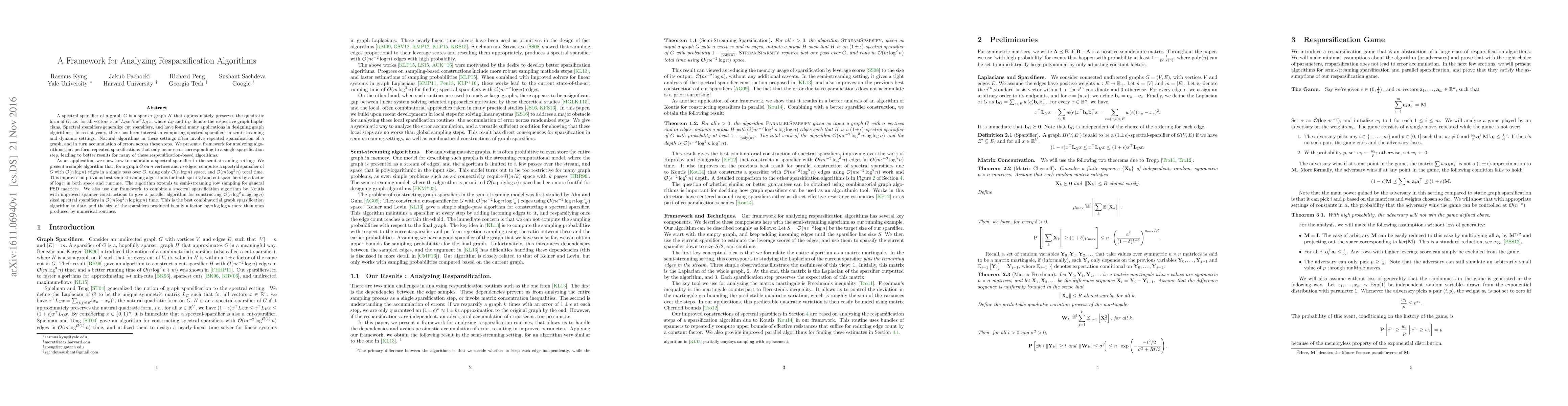 A spectral sparsifier of a graph $G$ is a sparser graph $H$ that approximately preserves the quadratic form of $G$, i.e. for all vectors $x$, $x^T L_G x \approx x^T L_H x$, where $L_G$ and $L_H$ denote the respective graph Laplacians. Spectral sparsifiers generalize cut sparsifiers, and have found many applications in designing graph algorithms. In recent years, there has been interest in computing spectral sparsifiers in semi-streaming and dynamic settings. Natural algorithms in these settings often involve repeated sparsification of a graph, and accumulation of errors across these steps. We present a framework for analyzing algorithms that perform repeated sparsifications that only incur error corresponding to a single sparsification step, leading to better results for many resparsification-based algorithms. As an application, we show how to maintain a spectral sparsifier in the semi-streaming setting: We present a simple algorithm that, for a graph $G$ on $n$ vertices and $m$ edges, computes a spectral sparsifier of $G$ with $O(n \log n)$ edges in a single pass over $G$, using only $O(n \log n)$ space, and $O(m \log^2 n)$ total time. This improves on previous best semi-streaming algorithms for both spectral and cut sparsifiers by a factor of $\log{n}$ in both space and runtime. The algorithm extends to semi-streaming row sampling for general PSD matrices. We also use our framework to combine a spectral sparsification algorithm by Koutis with improved spanner constructions to give a parallel algorithm for constructing $O(n\log^2{n}\log\log{n})$ sized spectral sparsifiers in $O(m\log^2{n}\log\log{n})$ time. This is the best known combinatorial graph sparsification algorithm.The size of the sparsifiers is only a factor $\log{n}\log\log{n}$ more than ones produced by numerical routines.