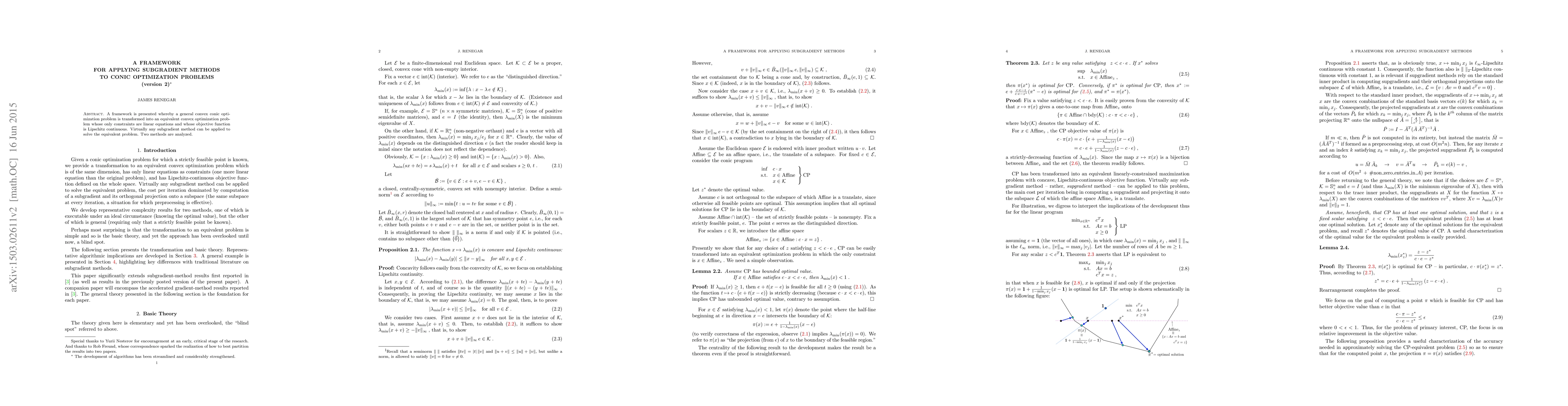 Summary: This paper introduces a framework transforming general convex conic optimization problems into equivalent linear-constrained, Lipschitz continuous optimization problems, enabling the application of various subgradient methods. Two specific subgradient methods are analyzed for their effectiveness.