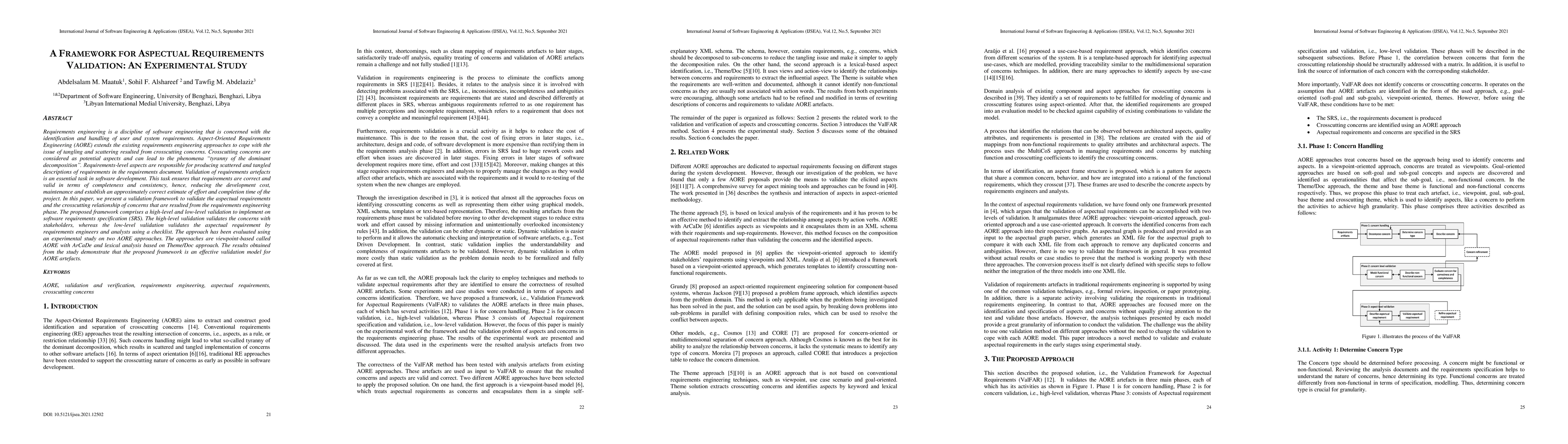 This paper introduces a validation framework for aspectual requirements in Aspect-Oriented Requirements Engineering (AORE), addressing crosscutting concerns causing tangling and scattering in requirements. The framework consists of high-level stakeholder validation and low-level engineer/analyst validation via checklists. The approach was tested on two AORE methods, AORE with ArCaDe and Theme/Doc, showing its effectiveness in validating AORE artifacts.